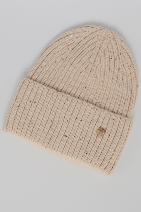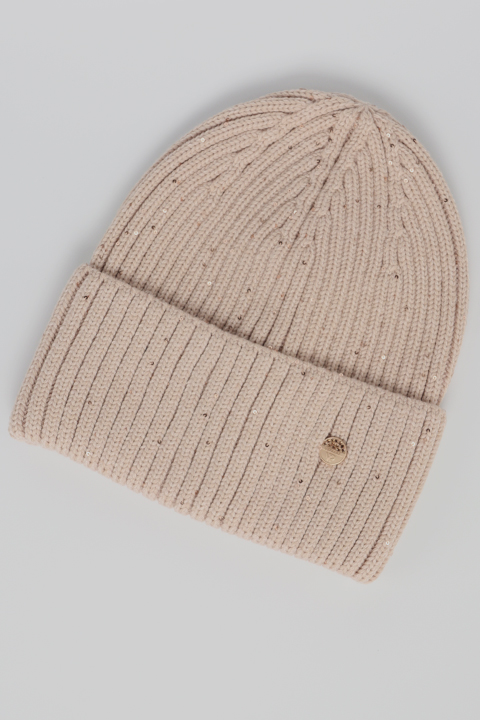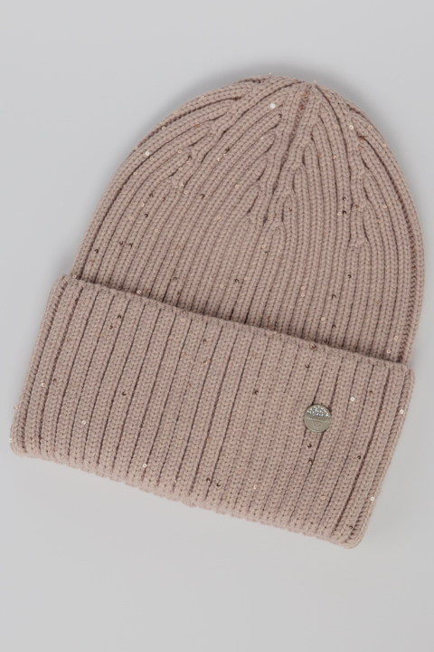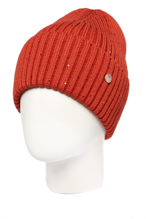 Шапка одинарная с отворотом, выполнена из эластичной пряжи с пайетками.