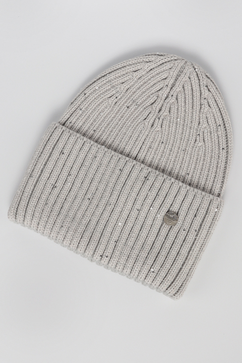 Шапка одинарная с отворотом, выполнена из эластичной пряжи с пайетками.