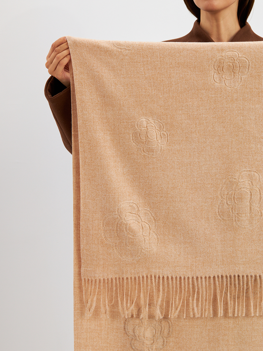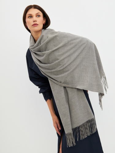 Большой, мягкий, теплый двусторонний однотонный палантин с принтом-печатью. Края изделия украшены бахромой. Машинная деликатная стирка.