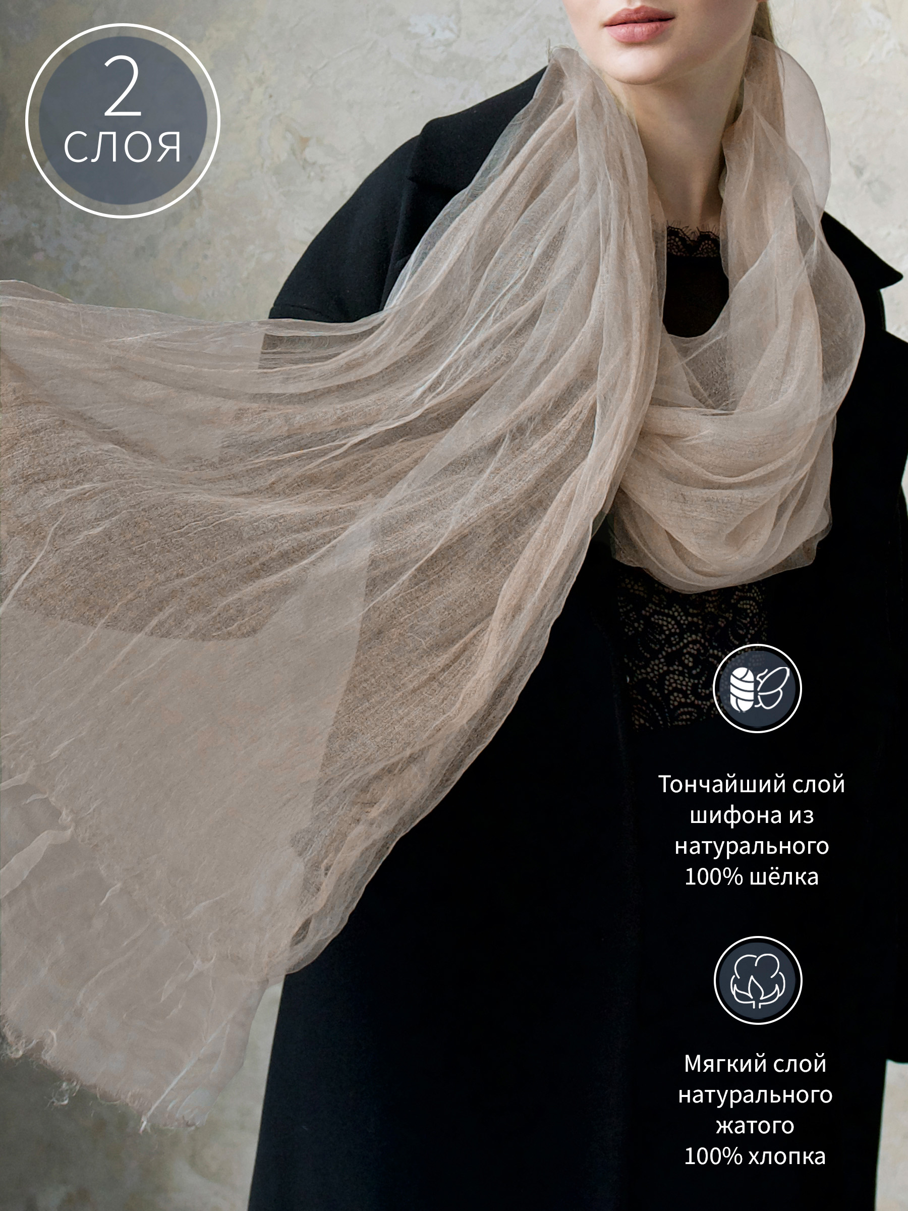 Уникальный своим дизайном двухслойный воздушный шарф не останется без внимания и удачно дополнит как элегантный вечерний образ, так и легкий стильный дневной наряд. Палантин выполнен из тончайшего, нежного шёлка и хлопка с использованием исключительной технологии обработки материала, что позволяет на себе ощутить необычайную мягкость и невесомость этих натуральных тканей. Удачная комбинация материалов и специальная окраска волокон позволили и сохранить естественный блеск шёлка, и задать глубокую, но мягкую цветовую гамму хлопку.