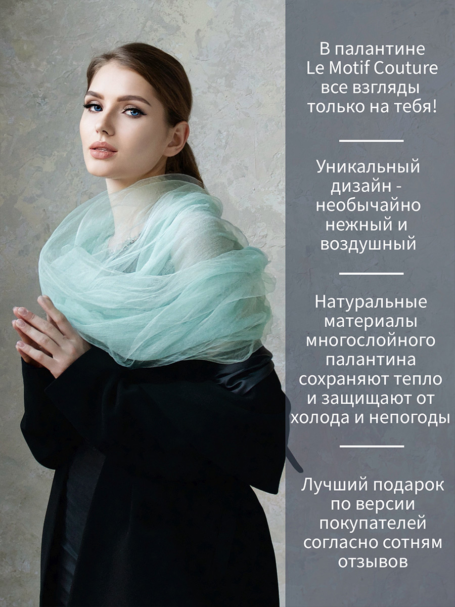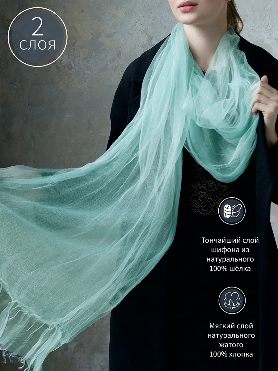 Уникальный своим дизайном двухслойный воздушный шарф не останется без внимания и удачно дополнит как элегантный вечерний образ, так и легкий стильный дневной наряд. Палантин выполнен из тончайшего, нежного шелка и хлопка с использованием исключительной технологии обработки материала, что позволяет на себе ощутить необычайную мягкость и невесомость этих натуральных тканей. Удачная комбинация материалов и специальная окраска волокон позволили и сохранить естественный блеск шёлка, и задать глубокую, но мягкую цветовую гамму хлопку.