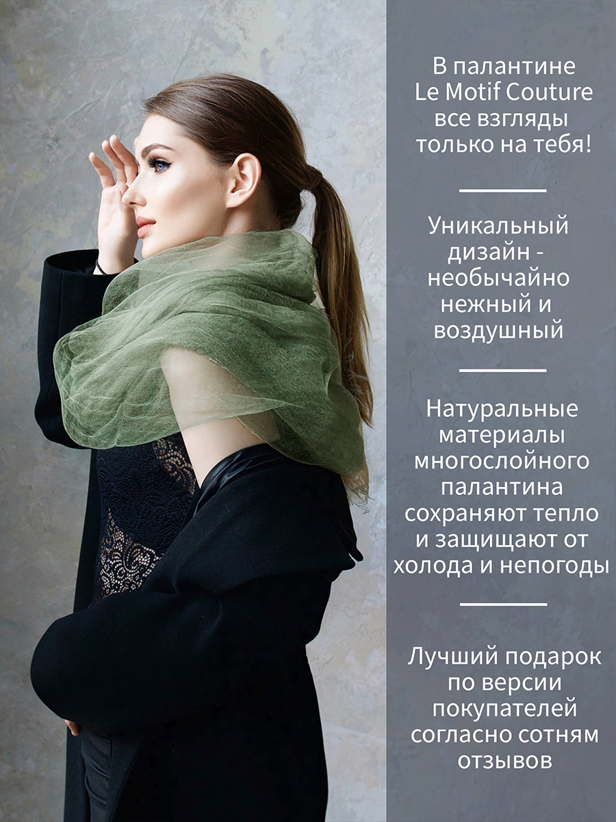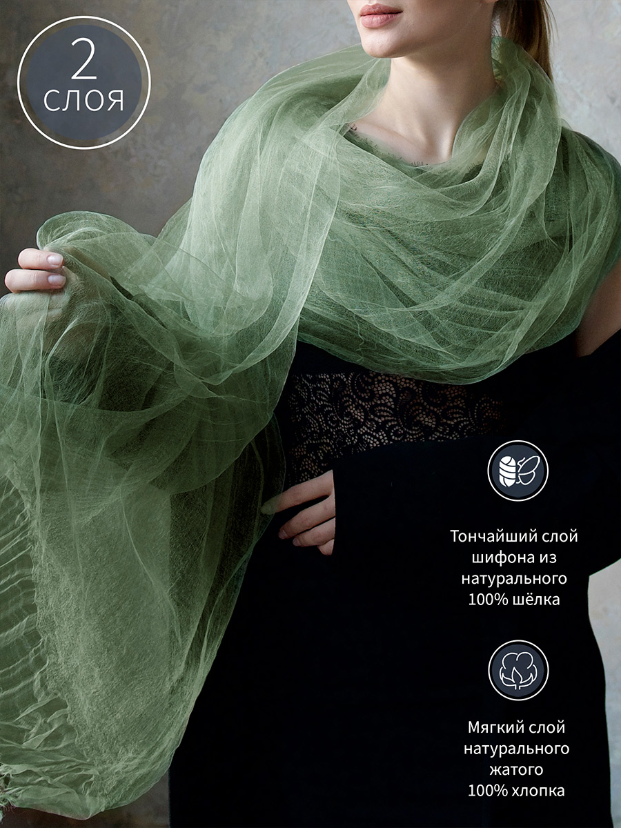 Уникальный своим дизайном двухслойный воздушный шарф не останется без внимания и удачно дополнит как элегантный вечерний образ, так и легкий стильный дневной наряд. Палантин выполнен из тончайшего, нежного шёлка и хлопка с использованием исключительной технологии обработки материала, что позволяет на себе ощутить необычайную мягкость и невесомость этих натуральных тканей. Удачная комбинация материалов и специальная окраска волокон позволили и сохранить естественный блеск шёлка, и задать глубокую, но мягкую цветовую гамму хлопку.