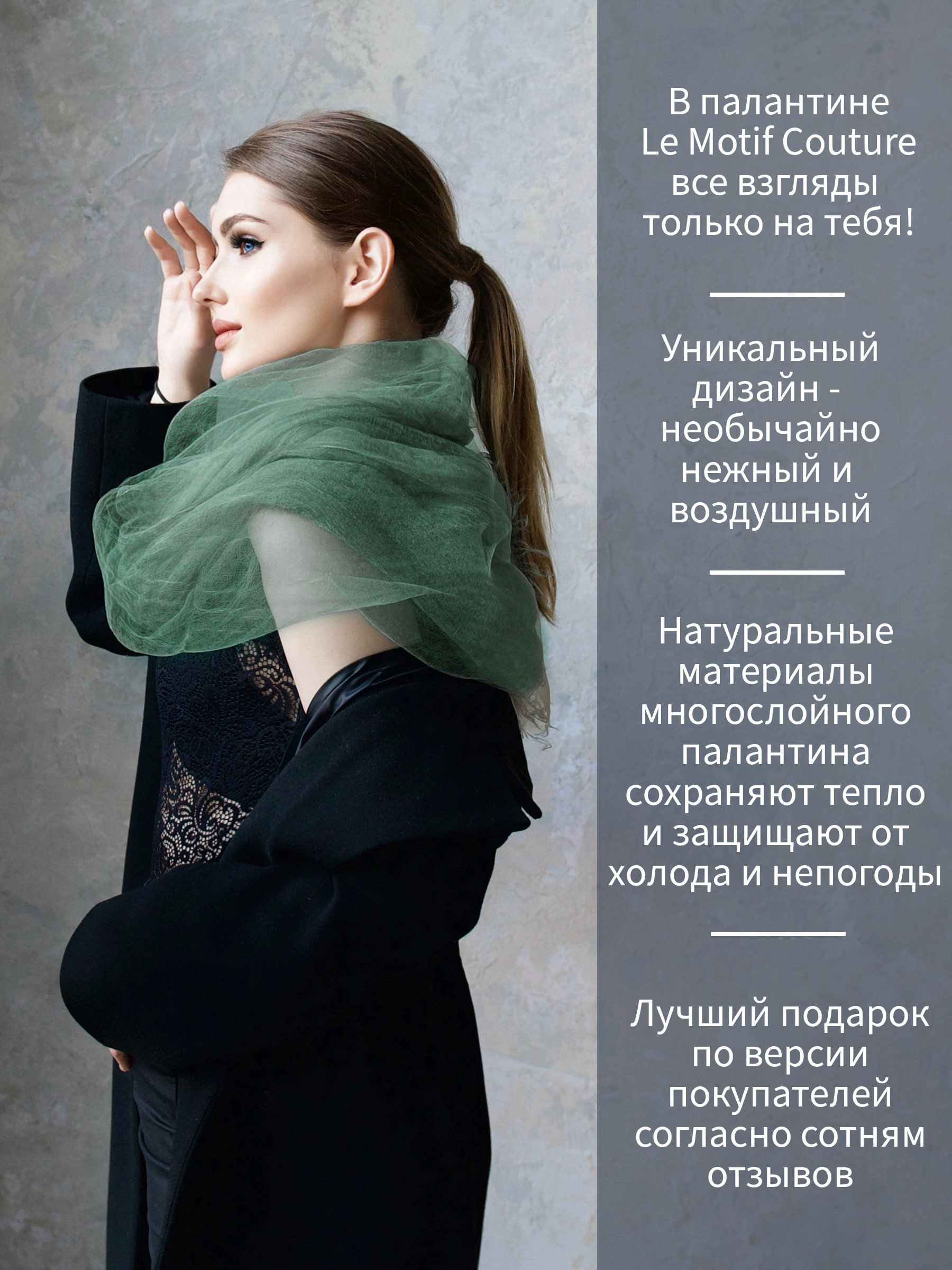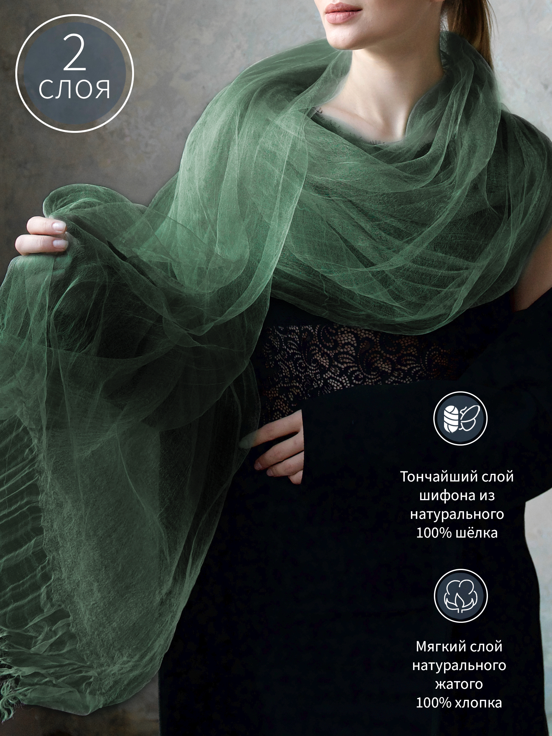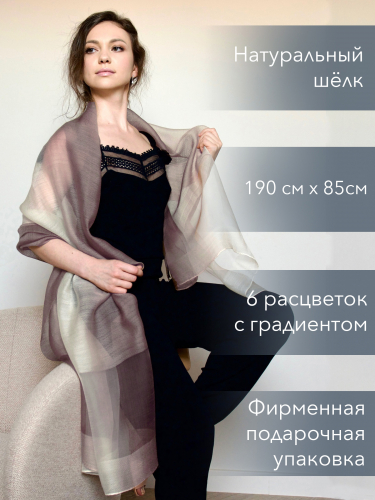 Уникальный своим дизайном двухслойный воздушный шарф не останется без внимания и удачно дополнит как элегантный вечерний образ, так и легкий стильный дневной наряд. Палантин выполнен из тончайшего, нежного шёлка и хлопка с использованием исключительной технологии обработки материала, что позволяет на себе ощутить необычайную мягкость и невесомость этих натуральных тканей. Удачная комбинация материалов и специальная окраска волокон позволили и сохранить естественный блеск шёлка, и задать глубокую, но мягкую цветовую гамму хлопку.
