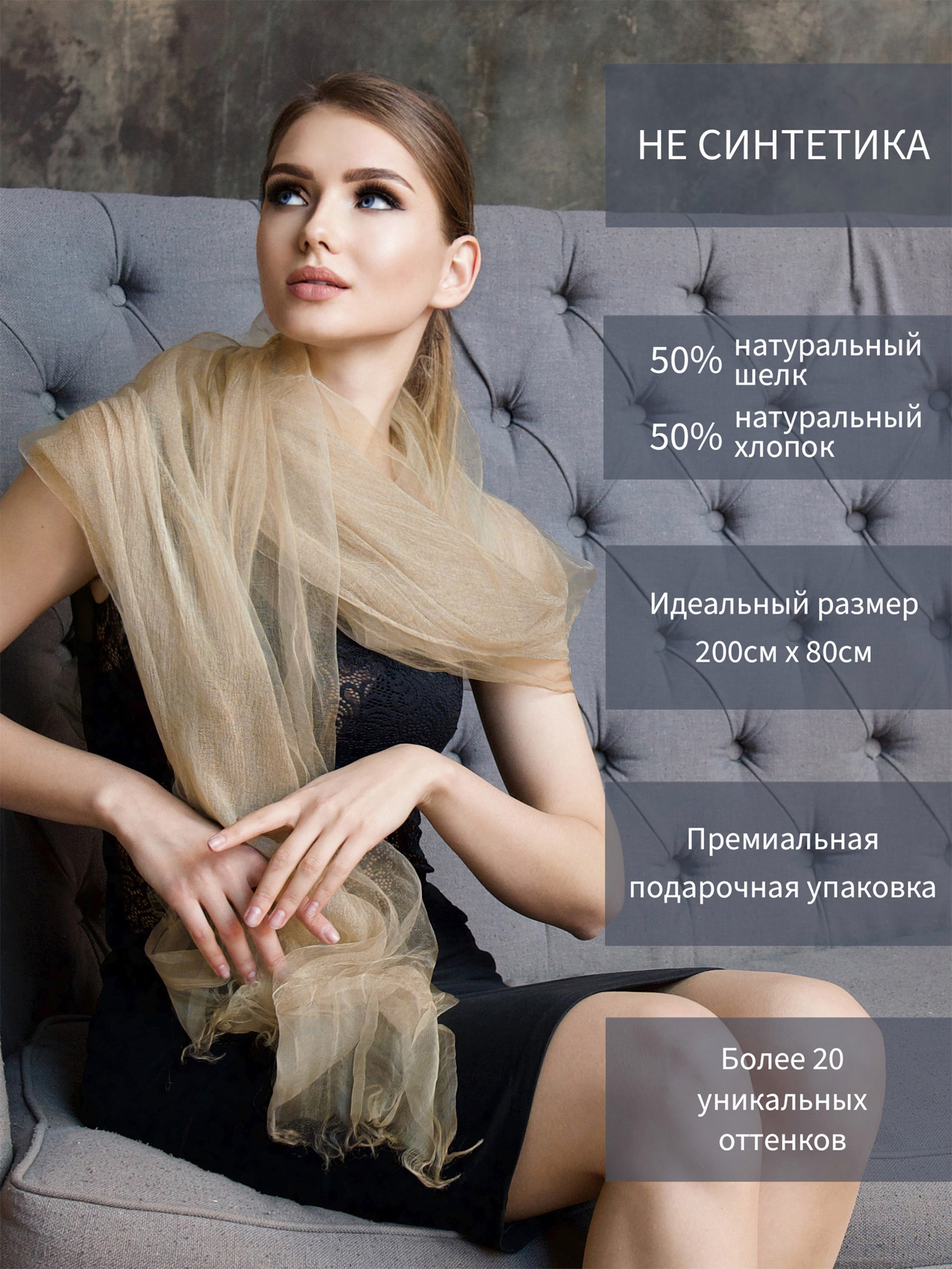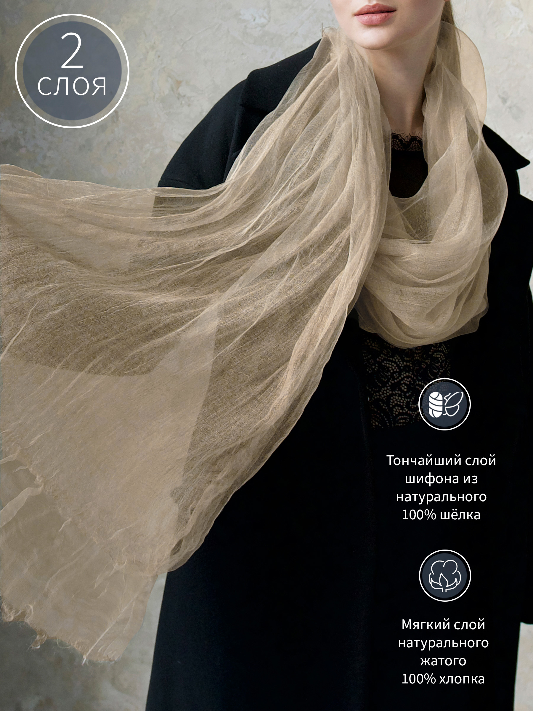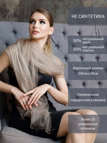 Уникальный своим дизайном двухслойный воздушный шарф не останется без внимания и удачно дополнит как элегантный вечерний образ, так и легкий стильный дневной наряд. Палантин выполнен из тончайшего, нежного шелка и хлопка с использованием исключительной технологии обработки материала, что позволяет на себе ощутить необычайную мягкость и невесомость этих натуральных тканей. Удачная комбинация материалов и специальная окраска волокон позволили и сохранить естественный блеск шёлка, и задать глубокую, но мягкую цветовую гамму хлопку.
