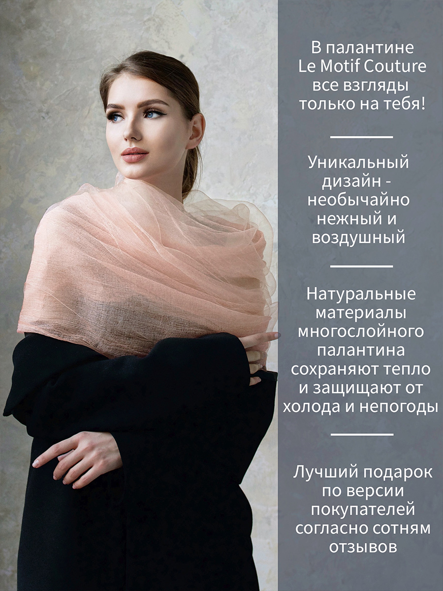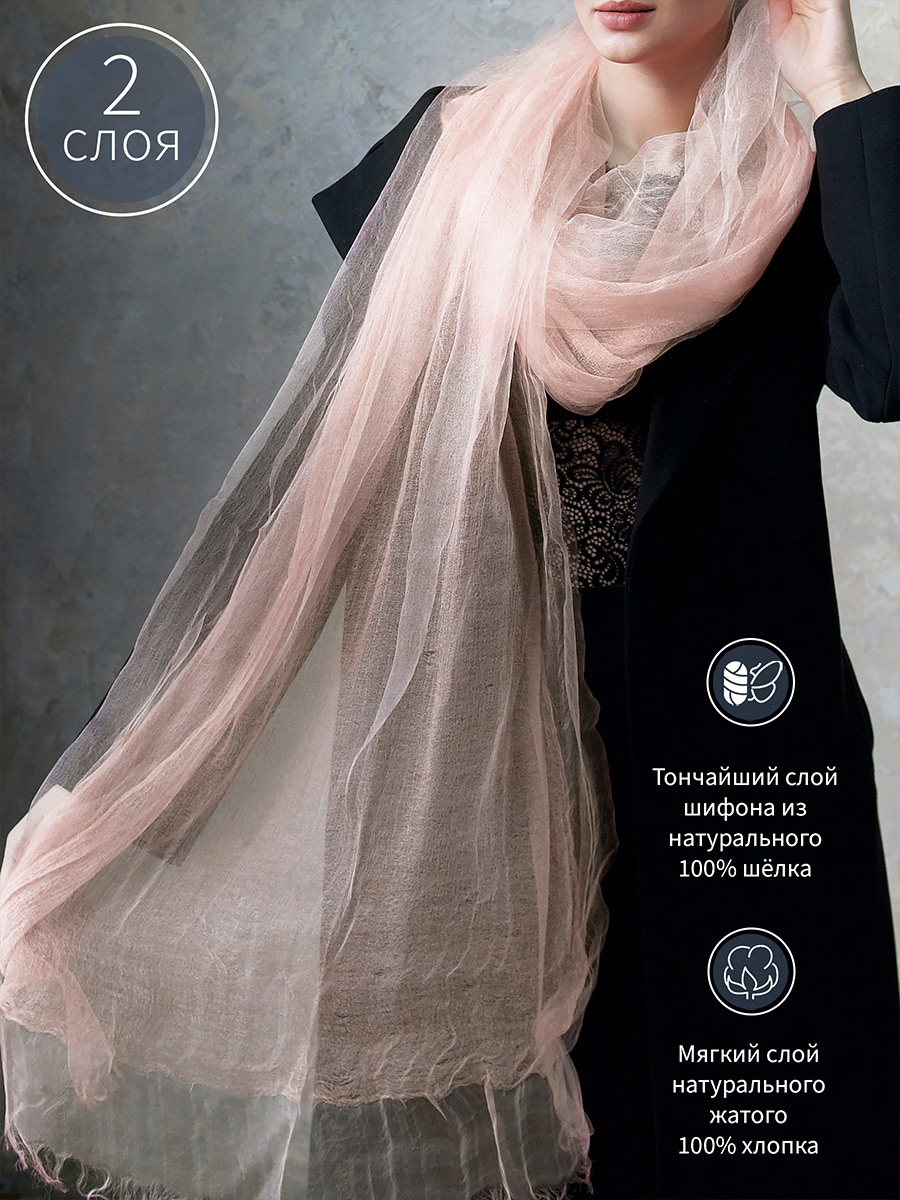 Уникальный своим дизайном двухслойный воздушный шарф не останется без внимания и удачно дополнит как элегантный вечерний образ, так и легкий стильный дневной наряд. Палантин выполнен из тончайшего, нежного шёлка и хлопка с использованием исключительной технологии обработки материала, что позволяет на себе ощутить необычайную мягкость и невесомость этих натуральных тканей. Удачная комбинация материалов и специальная окраска волокон позволили и сохранить естественный блеск шёлка, и задать глубокую, но мягкую цветовую гамму хлопку.
