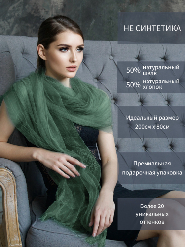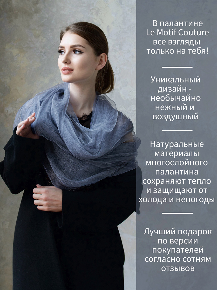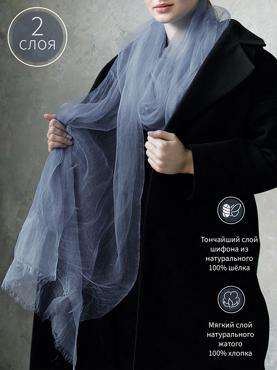 Уникальный своим дизайном двухслойный воздушный шарф не останется без внимания и удачно дополнит как элегантный вечерний образ, так и легкий стильный дневной наряд. Палантин выполнен из тончайшего, нежного шёлка и хлопка с использованием исключительной технологии обработки материала, что позволяет на себе ощутить необычайную мягкость и невесомость этих натуральных тканей. Удачная комбинация материалов и специальная окраска волокон позволили и сохранить естественный блеск шёлка, и задать глубокую, но мягкую цветовую гамму хлопку.