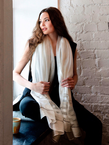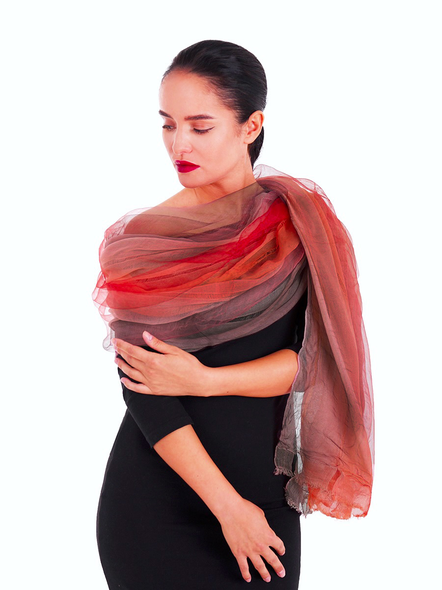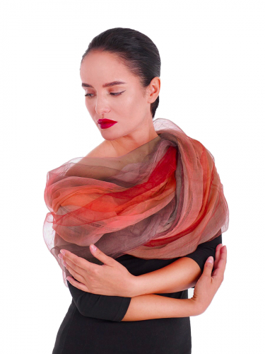Уникальный своим дизайном двухслойный воздушный палантин не останется без внимания и удачно дополнит как элегантный вечерний образ, так и стильный дневной наряд. Палантин выполнен из нежного шёлка и мягкой вискозы, с использованием исключительной технологии обработки материалов, что позволяет на себе ощутить необычайную невесомость этих тканей. Удачная комбинация материалов и специальная окраска волокон позволили сохранить естественный блеск шёлка и задать глубокую, но мягкую цветовую гамму вискозы с переходом цвета, которая подчеркнет вашу индивидуальность и выделит среди остальных.