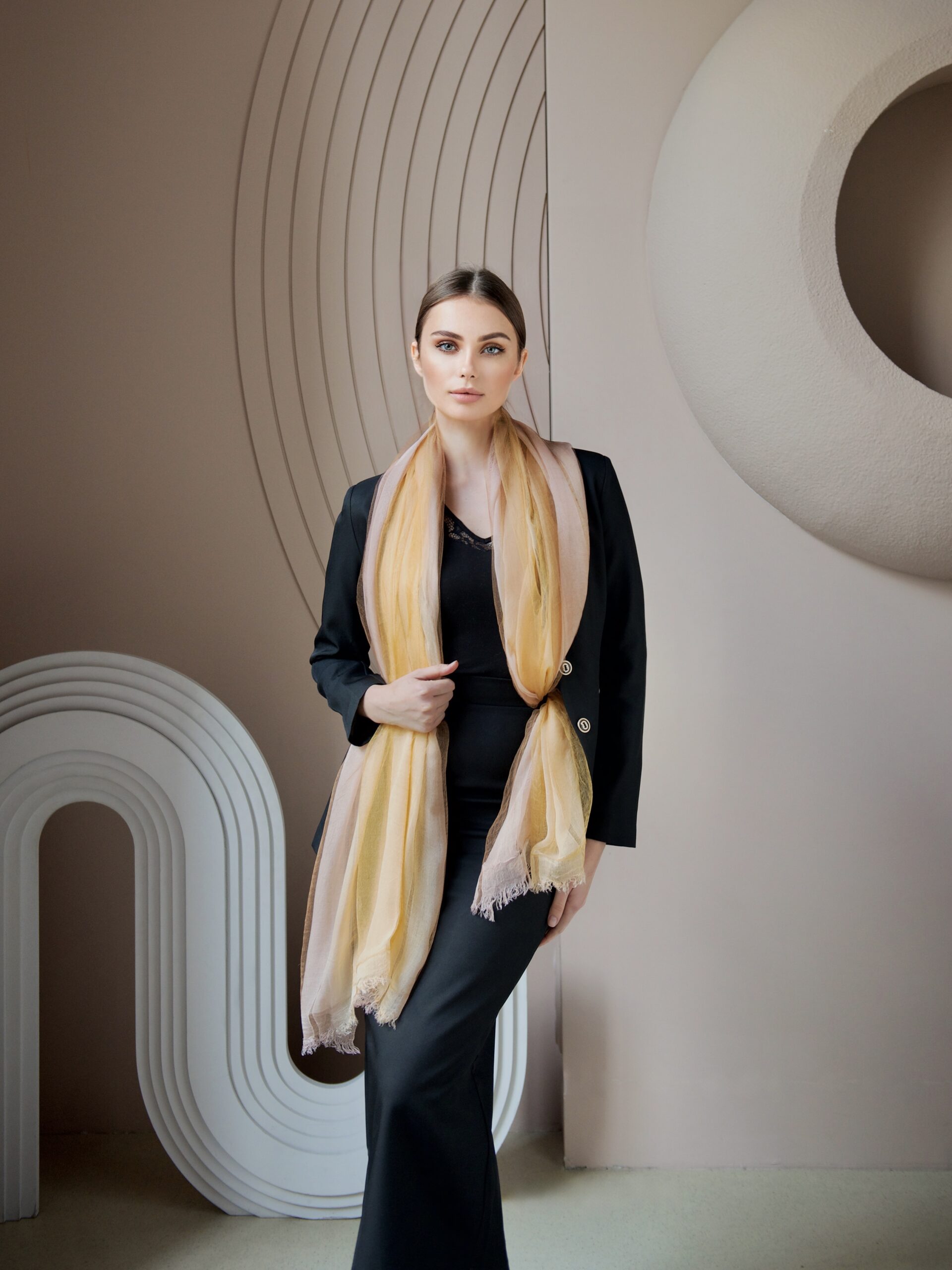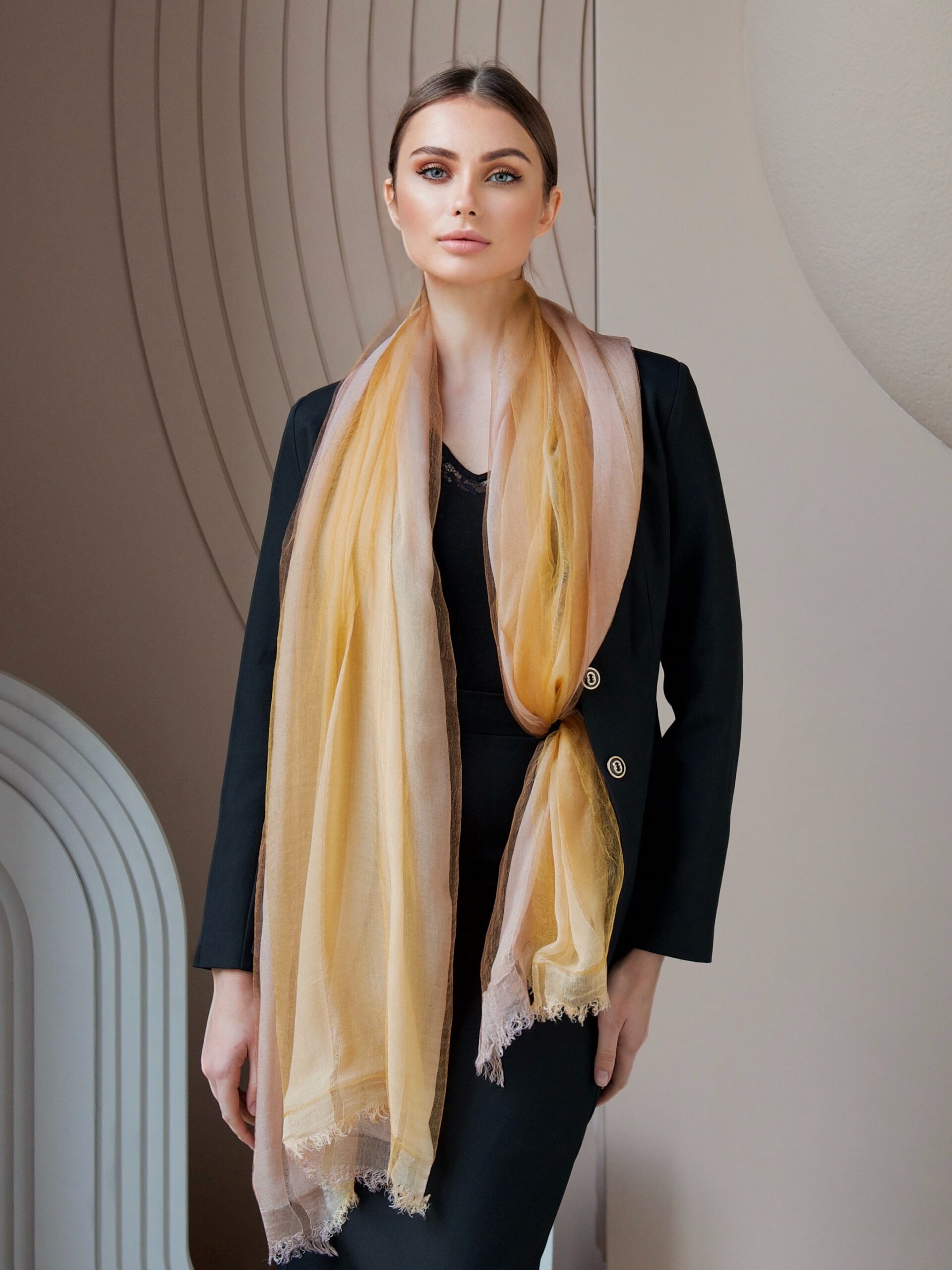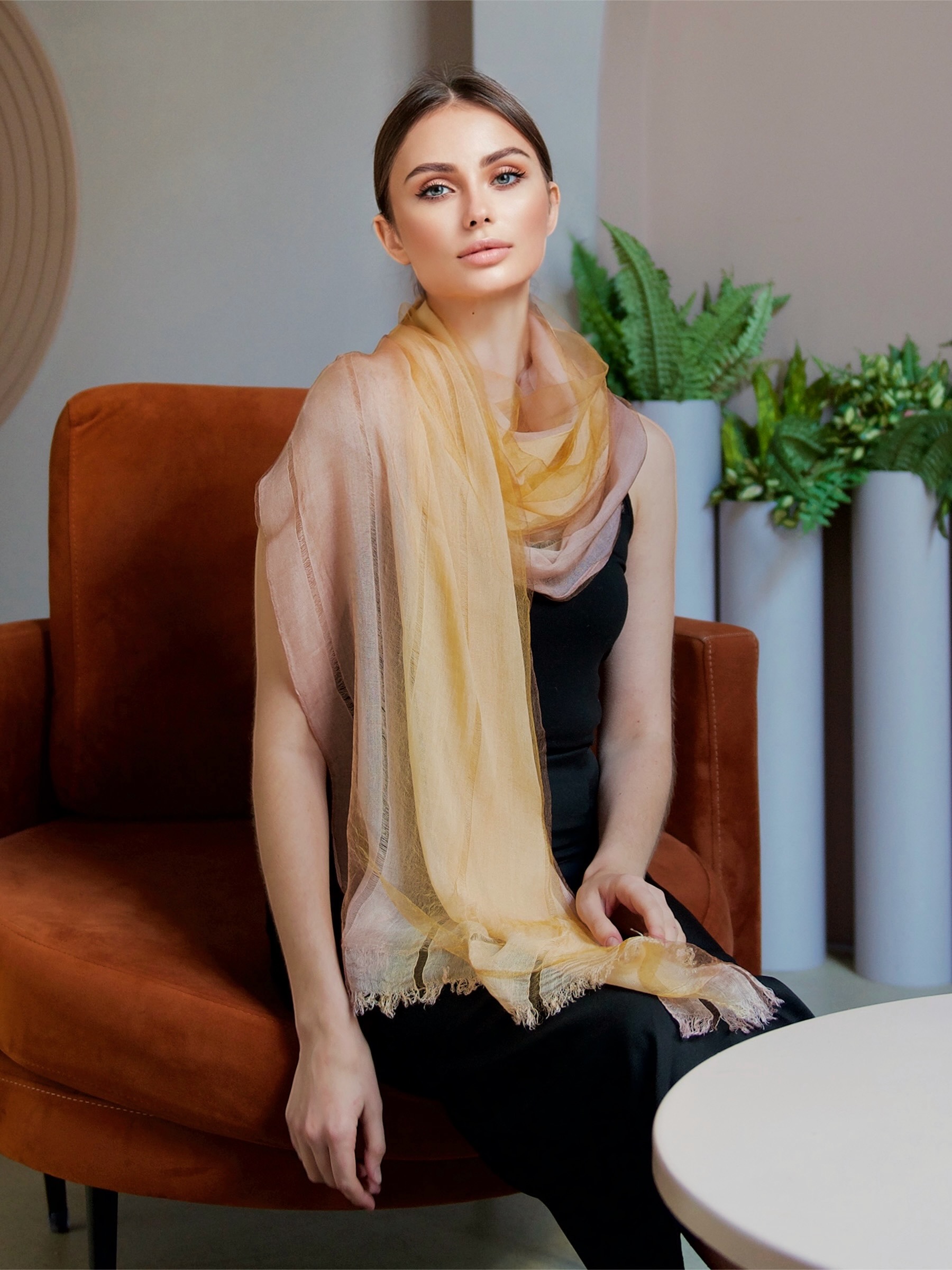 Уникальный своим дизайном двухслойный воздушный палантин не останется без внимания и удачно дополнит как элегантный вечерний образ, так и стильный дневной наряд. Палантин выполнен из нежного шёлка и мягкой вискозы, с использованием исключительной технологии обработки материалов, что позволяет на себе ощутить необычайную невесомость этих тканей. Удачная комбинация материалов и специальная окраска волокон позволили сохранить естественный блеск шёлка и задать глубокую, но мягкую цветовую гамму вискозы с переходом цвета, которая подчеркнет вашу индивидуальность и выделит среди остальных.