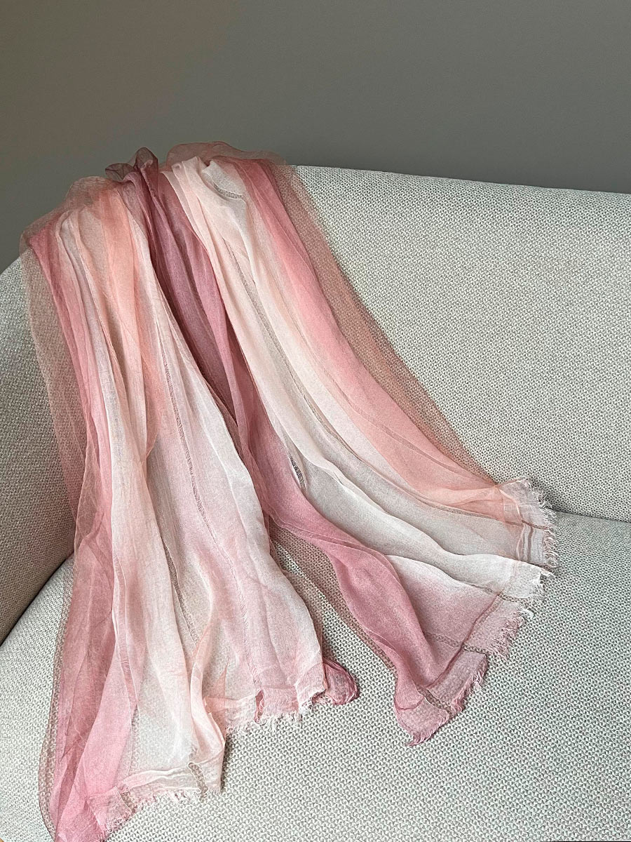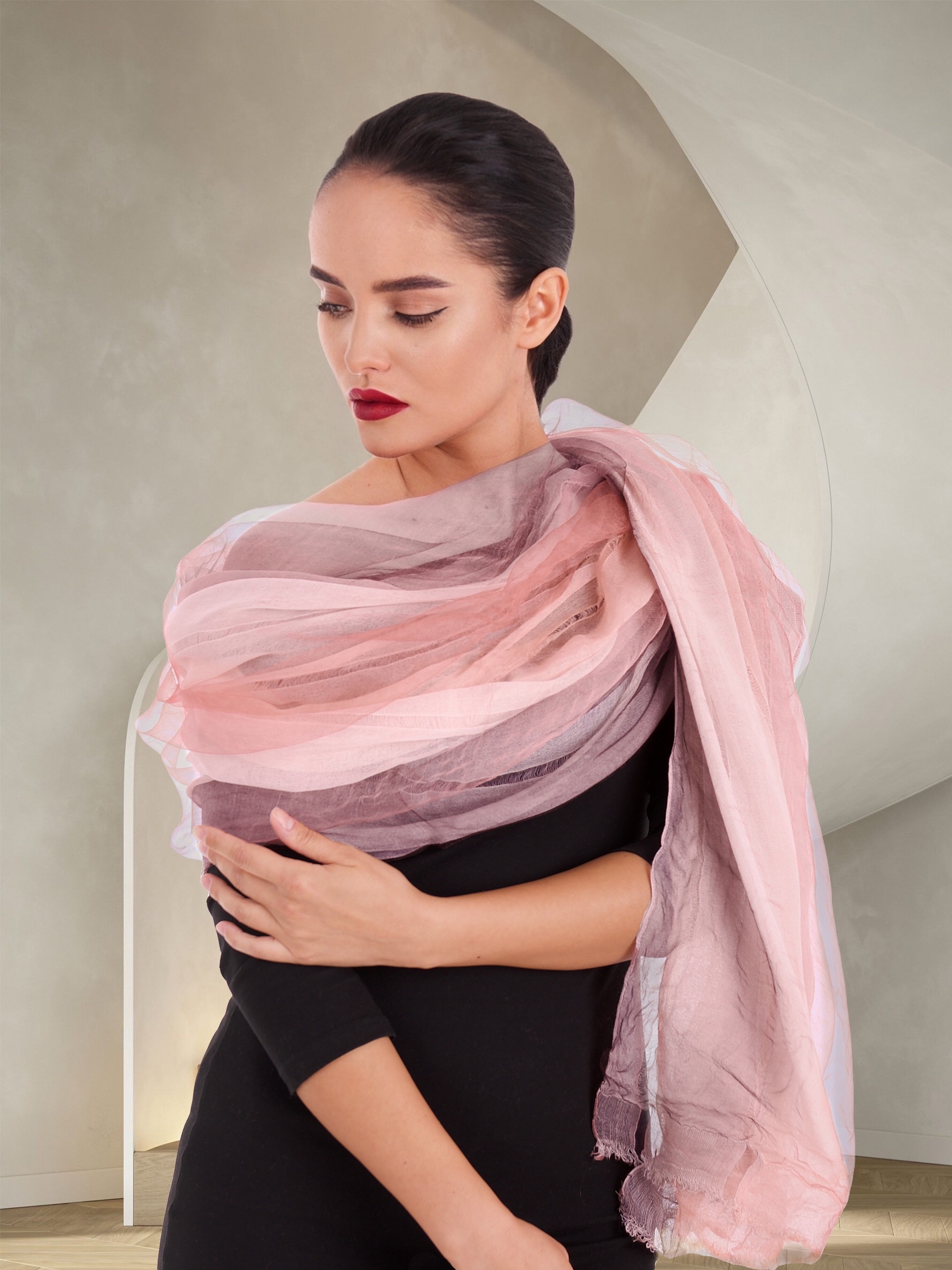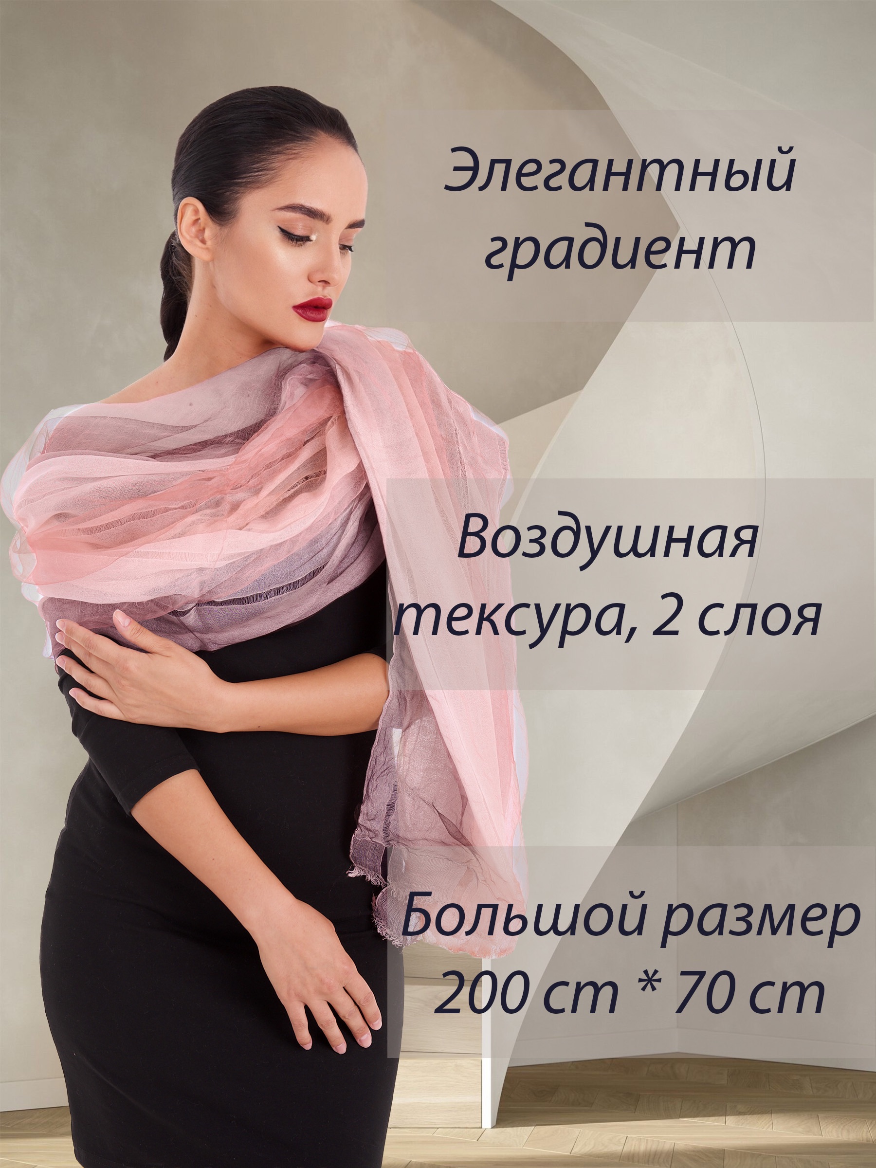 Уникальный своим дизайном двухслойный воздушный палантин не останется без внимания и удачно дополнит как элегантный вечерний образ, так и стильный дневной наряд. Палантин выполнен из нежного шёлка и мягкой вискозы, с использованием исключительной технологии обработки материалов, что позволяет на себе ощутить необычайную невесомость этих тканей. Удачная комбинация материалов и специальная окраска волокон позволили сохранить естественный блеск шёлка и задать глубокую, но мягкую цветовую гамму вискозы с переходом цвета, которая подчеркнет вашу индивидуальность и выделит среди остальных.