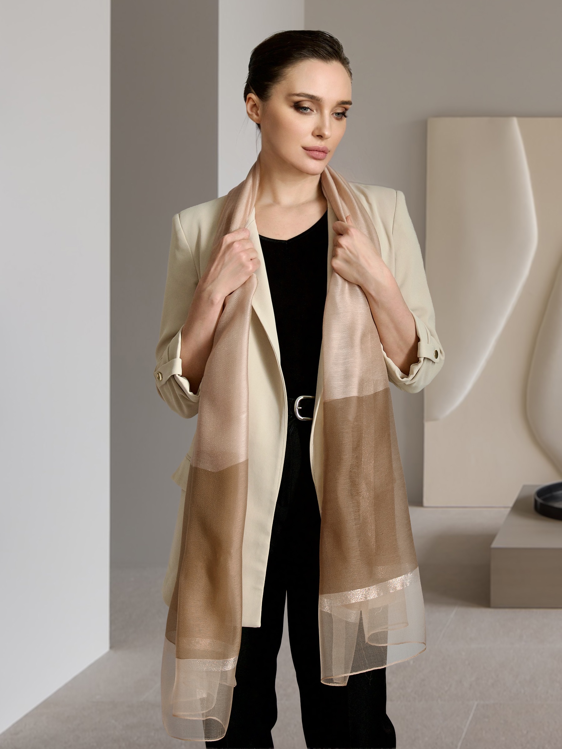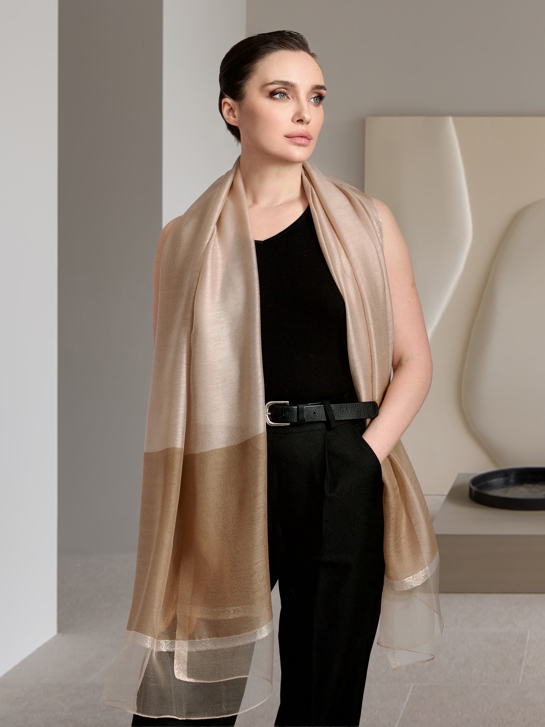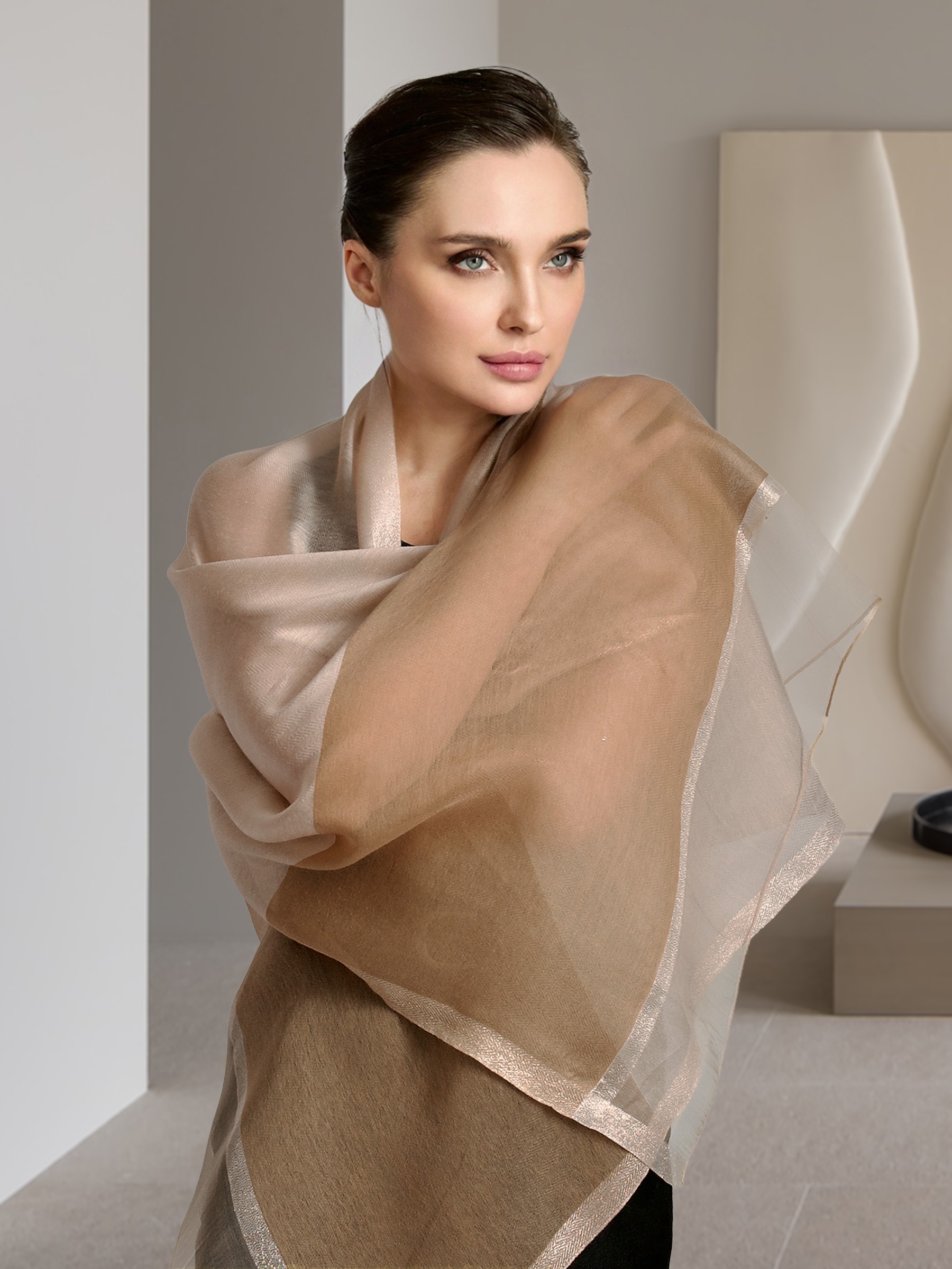 Уникальный своим дизайном воздушный палантин не останется без внимания и удачно дополнит как элегантный вечерний образ, так и стильный дневной наряд. Палантин выполнен из нежного шёлка и мягкой шерсти, с декоративной отделкой из мягкой золотой нити. Удачная комбинация материалов и специальная окраска волокон позволили сохранить естественный блеск шёлка и задать глубокую, но мягкую цветовую гамму шерсти. Такой аксессуар подчеркнет вашу индивидуальность и выделит среди остальных.