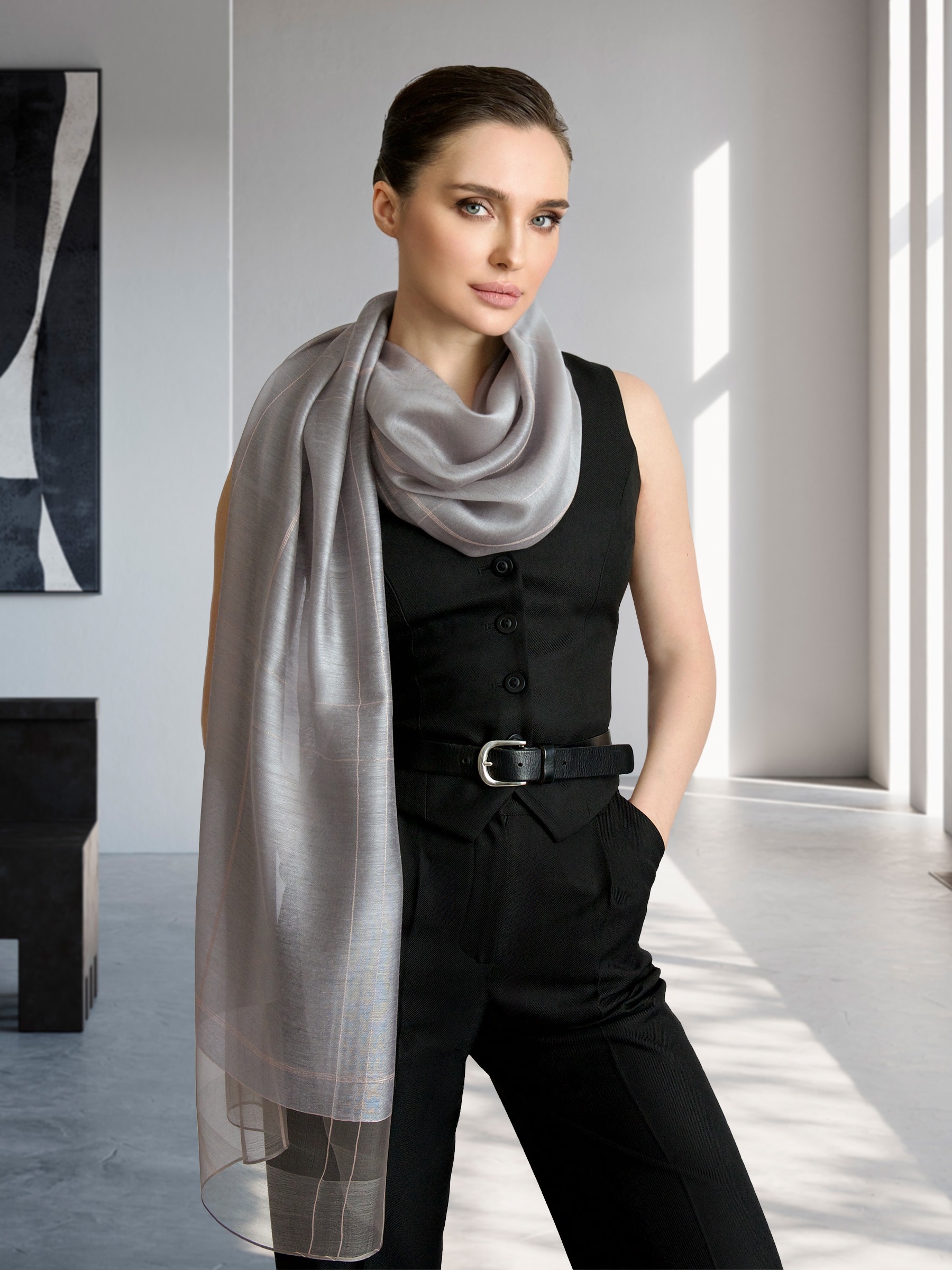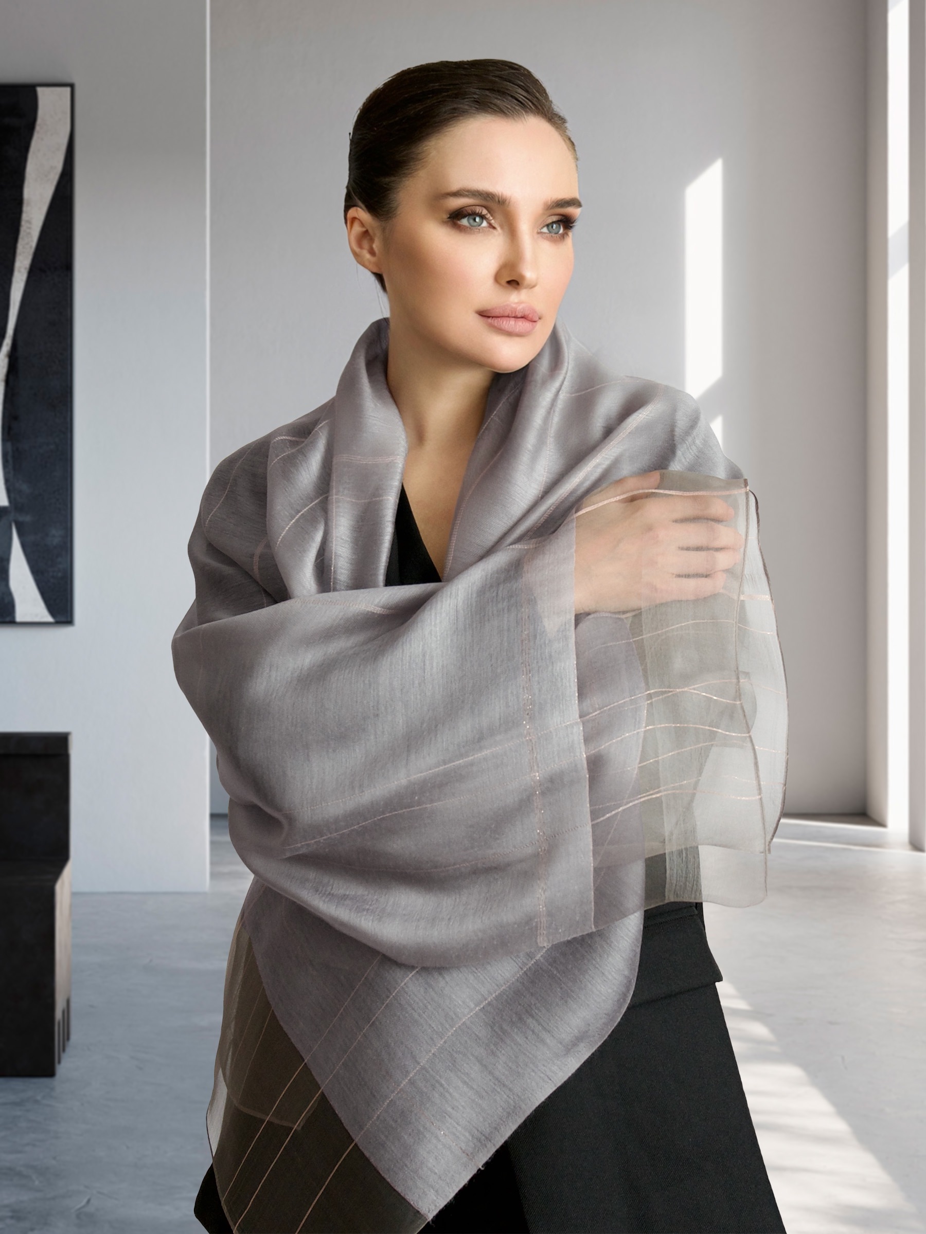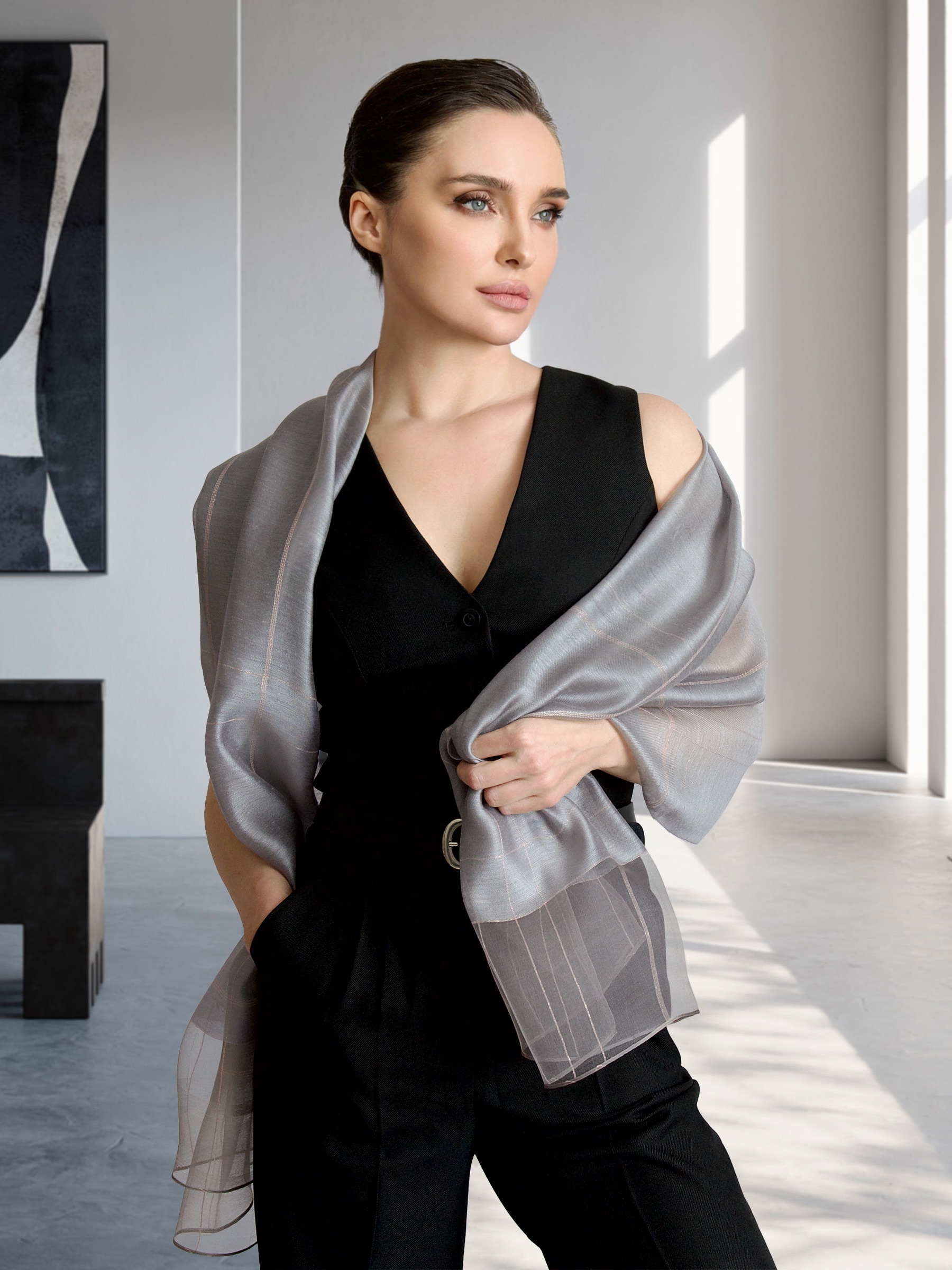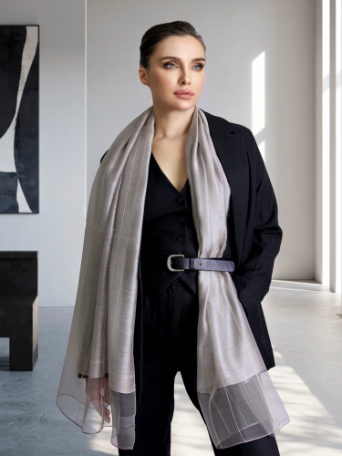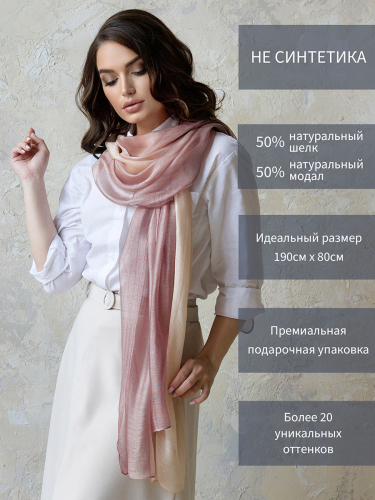 Уникальный своим дизайном мягкий шелковый палантин не останется без внимания и удачно дополнит как элегантный вечерний образ, так и стильный дневной наряд. Палантин выполнен из нежного шёлка и мягкой шерсти, с декоративной отделкой из мягкой нити. Удачная комбинация материалов и специальная окраска волокон позволили сохранить естественный блеск шёлка и задать глубокую, но мягкую цветовую гамму шерсти. Такой аксессуар подчеркнет вашу индивидуальность и выделит среди остальных.