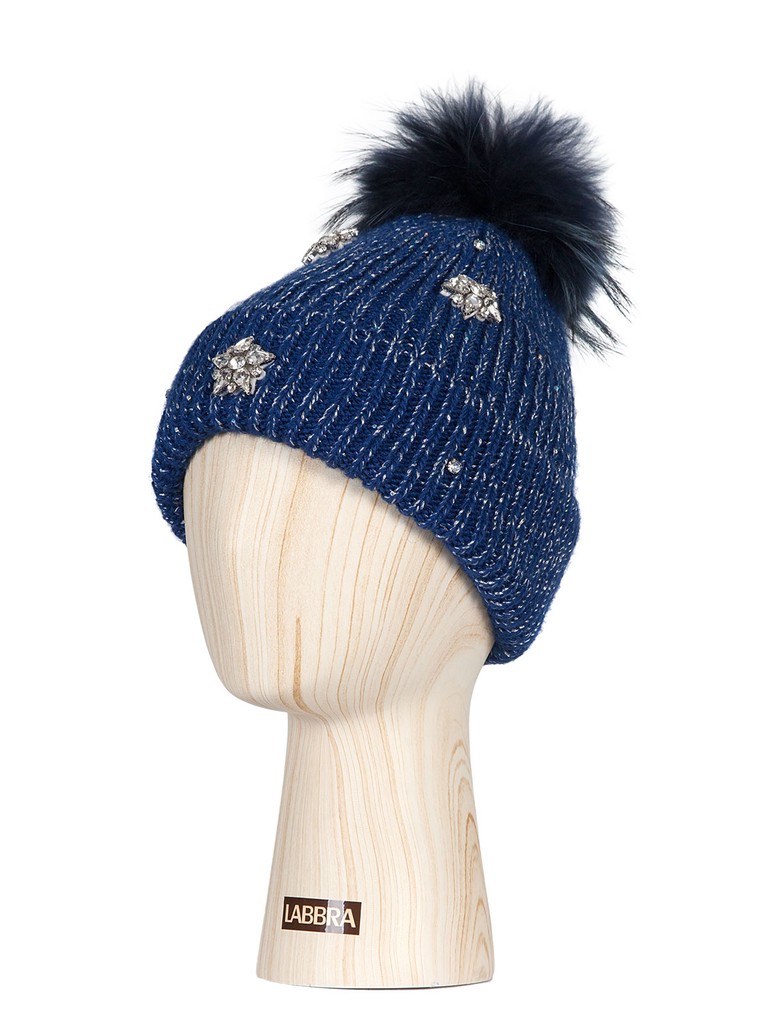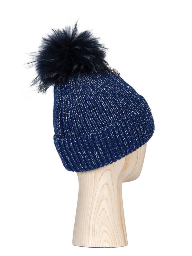 Классическая форма шапки-бини, выполнена из теплой итальянской пряжи с добавлением нити с мелкими пайетками. Лицевая часть декорирована блестящей фурнитурой в виде камней и выложенных из них цветков. Шапка с теплой флисовой подкладкой, что позволит оставаться в тепле даже в самые стойкие морозы. А съёмный помпон из натурального меха енота идеально завершает красивое изделие!