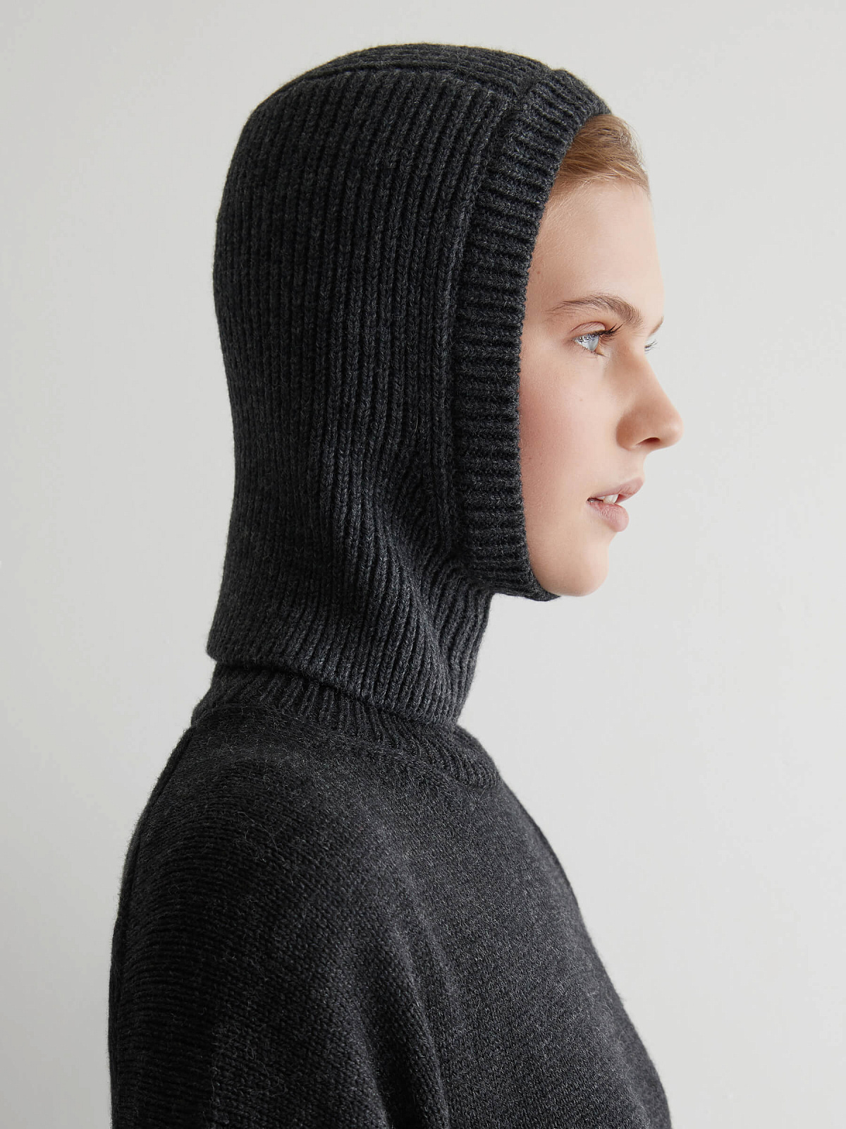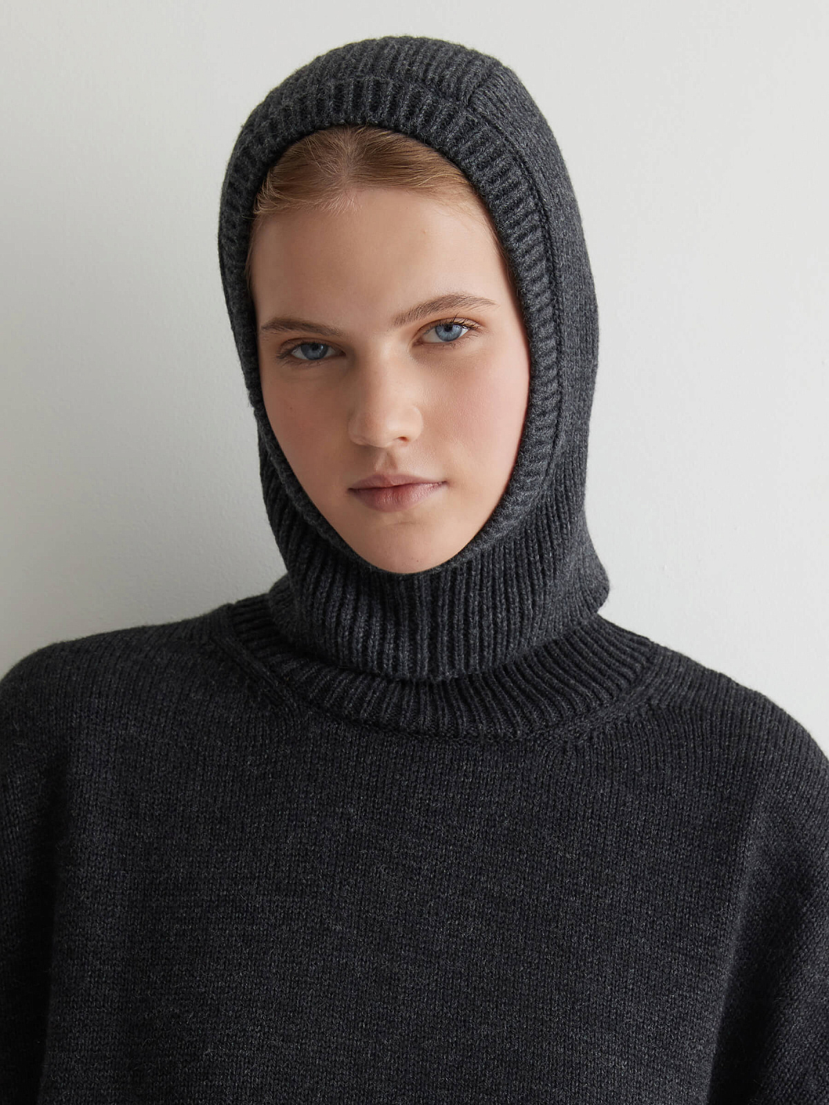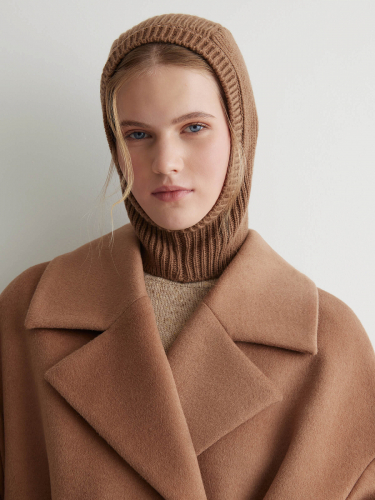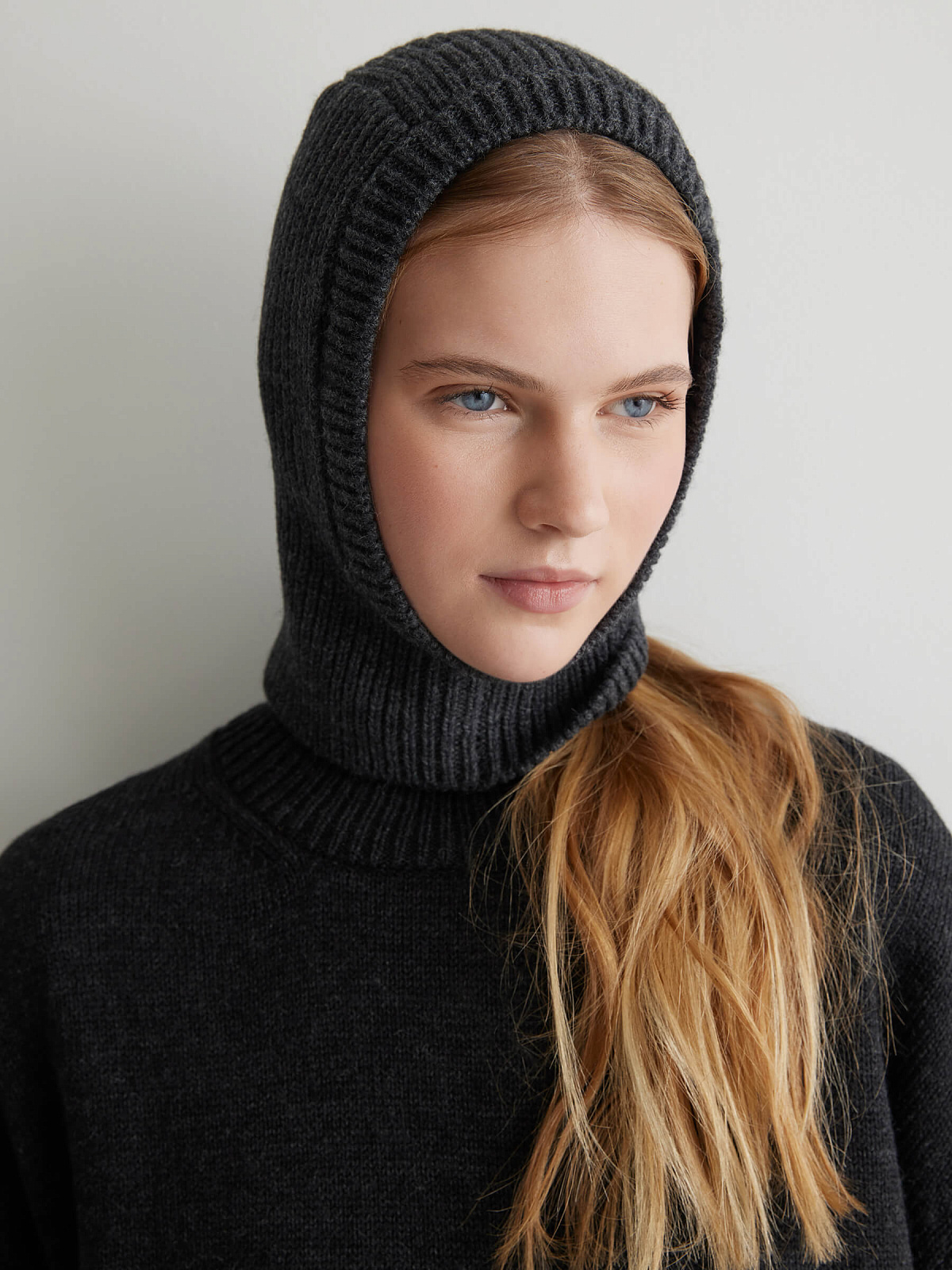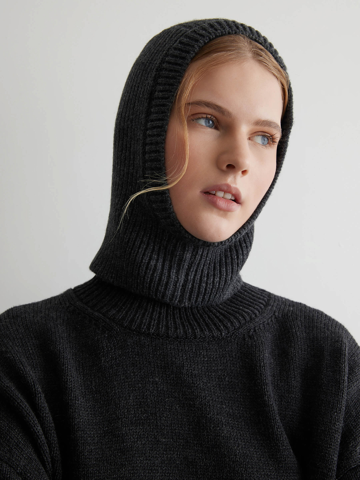 Капор из шерсти с добавлением акрила прилегающей посадки и с резинкой по горловине.