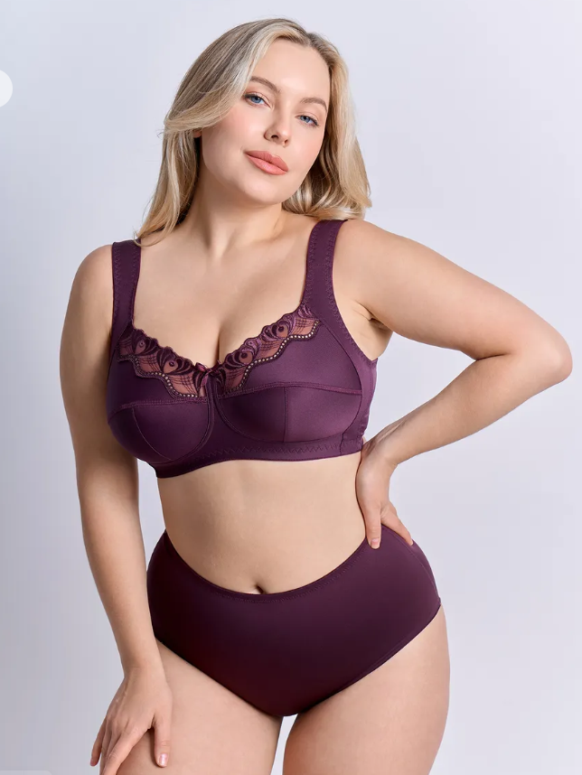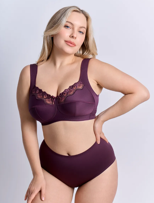 Все швы и края обработаны эластичными отделочными лентами для комфорта и долговечности. Удобные эластичные бретели с усилением из дублированного полотна гарантируют надёжную поддержку и распределение веса, что особенно важно для больших размеров. Застёжка сзади на крючках и петлях позволяет легко отрегулировать плотность посадки. Центральный бантик добавляет завершённый и утончённый акцент, делая эту модель не просто практичной, но и красивой частью вашего гардероба.