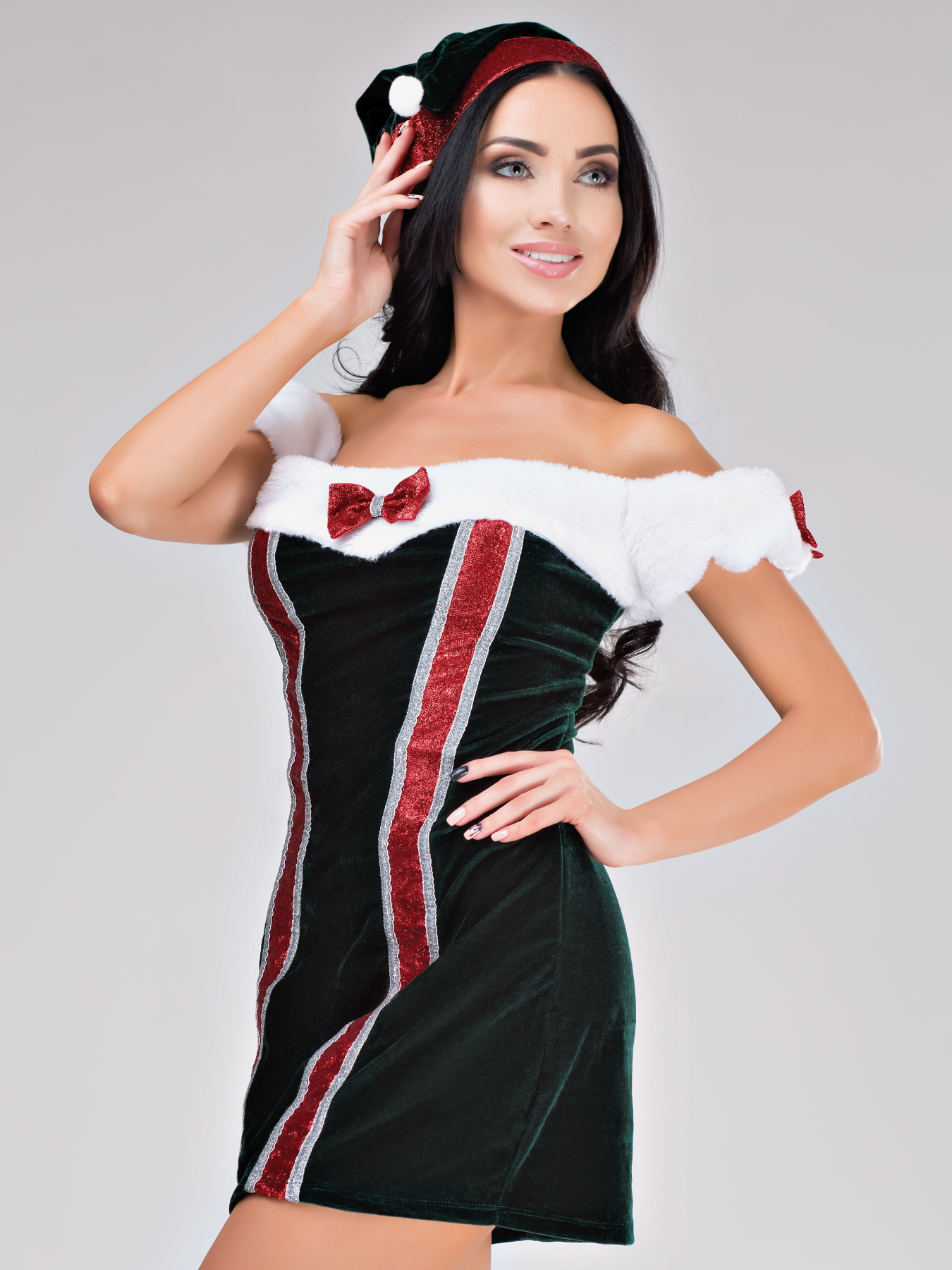 Праздничный костюм рождественского эльфа. Сочетание роскошной бархатистой эластичной ткани изумрудного цвета, белого меха и блестящих деталей из мерцающей красной ленты с серебристым кантом создаёт ощущение праздника и предвкушение весёлых новогодних вечеринок. Задорный колпак и красные стринги дополняют сказочный образ.