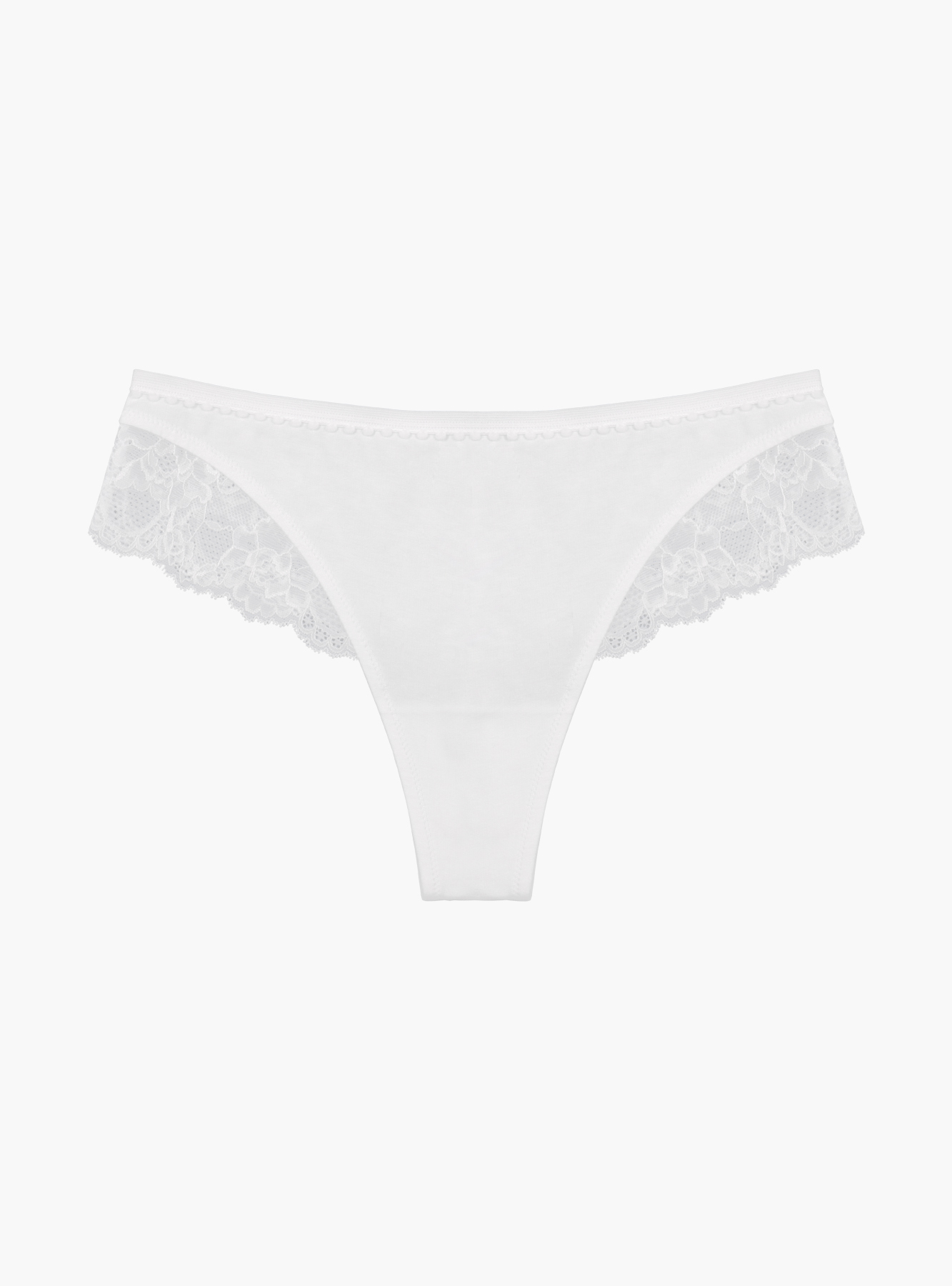Белые стринги из сочетания хлопка и бамбука. Ажурное кружево плавно переходит с задней части на переднюю, создавая эффект рюшек в передней части.