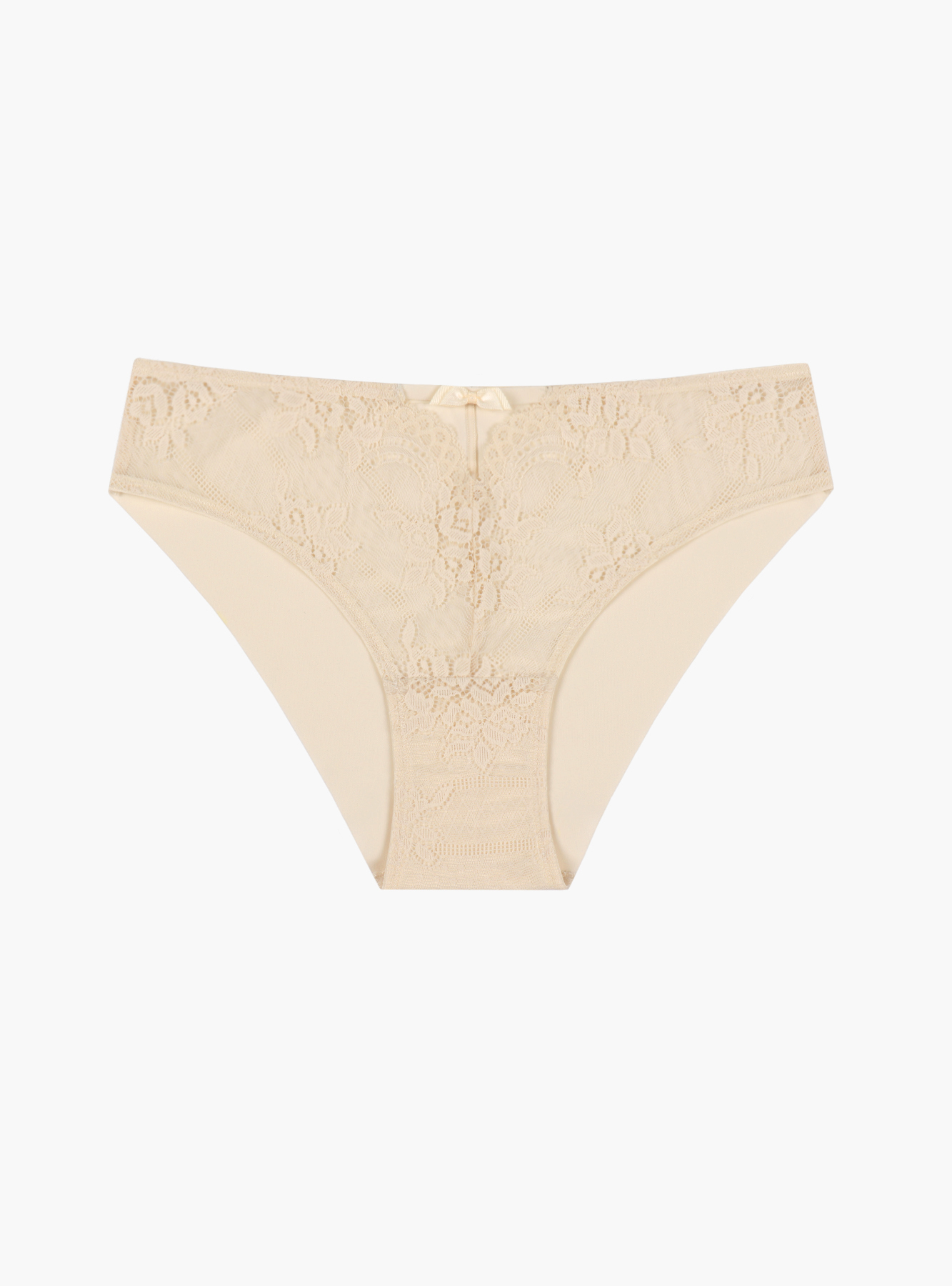 Трусы-слипы нежного бежевого оттенка, выполненные из мягкой эластичной ткани. Модель украшена изящной кружевной вставкой с миниатюрным бантиком в передней части.