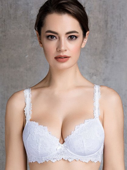 Оптовая продажа. Бюстгальтер-балконет женский с формованными чашками. Модель выполнена из кружева. Передняя часть стана дублирована хлопком. Бретели регулируются по длине, съемные, спереди декорированы кружеовм.