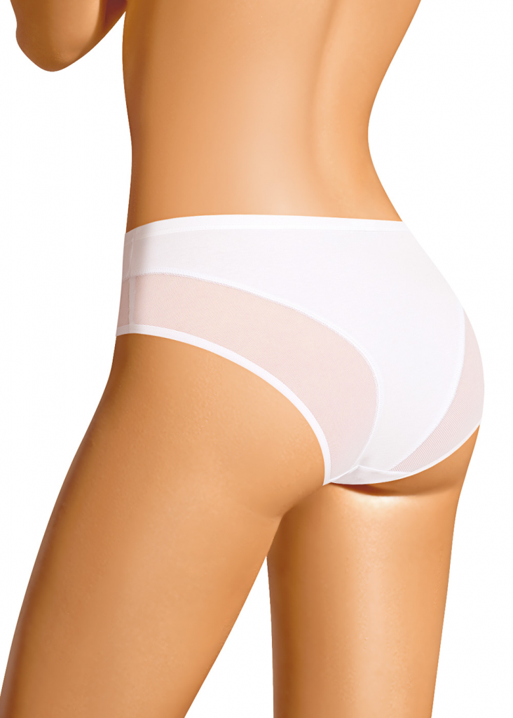 Трусы слипы женские из эластичного хлопкового полотна. Обработка краев по талии жаккардовая резинка, по ноге - полуокантовка. По переду и спинке- вставки из сетки, швы застилом.