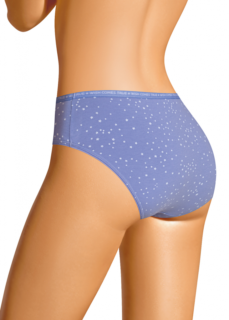 Трусы слипы женские из эластичного хлопкового полотна. Обработка краев по талии - окантовочная резинка с принтом, по ноге - полуокантовка.