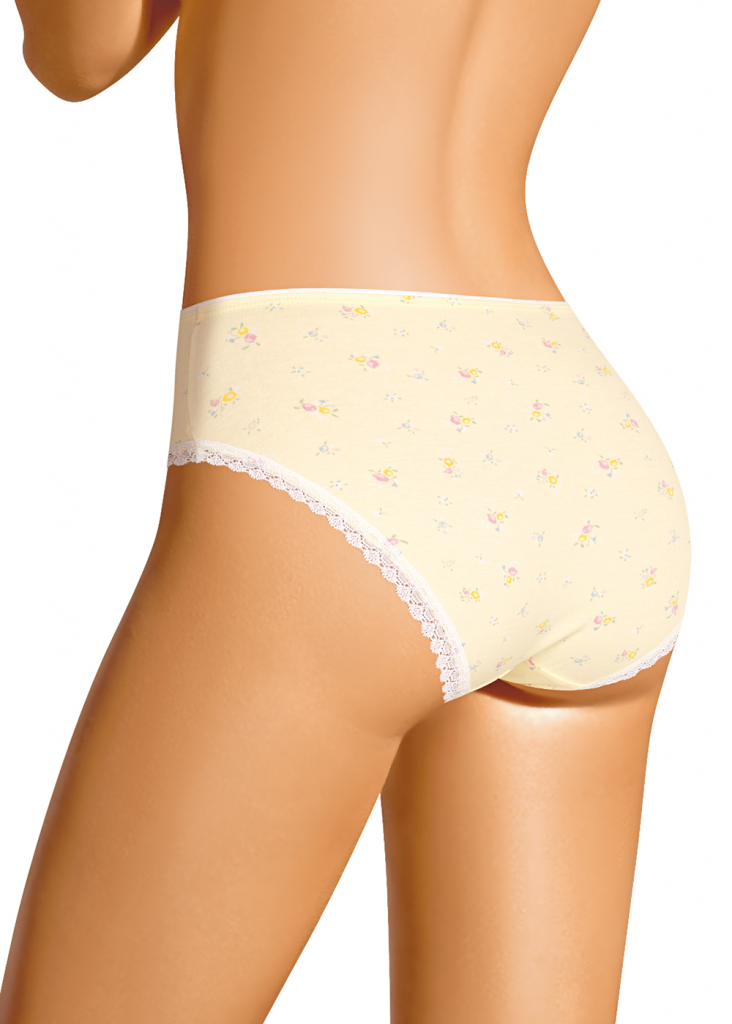 Трусы слипы женские из эластичного хлопкового полотна. Обработка краев по талии - резинка с кантом, по ноге - узкое кружево. По переду сборка на резинку, атласный бант.