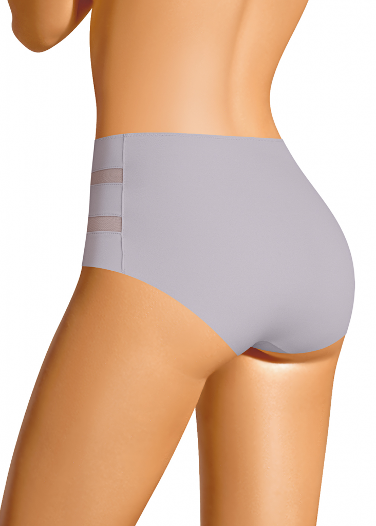 Трусы слипы с завышенной посадкой, сзади и сбоку бесшовная гладкая обработка, спереди декоративные горизонтальные вставки из плотной сетки, перед дублирован сеткой, по талии обработка с зигзагом и узкой резинкой.