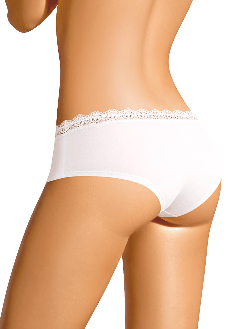 Трусы шорты женские из эластичного хлопкового полотна. Обработка краев по талии - узкое кружево, по ноге - подгибка. Спереди узкое кружево.