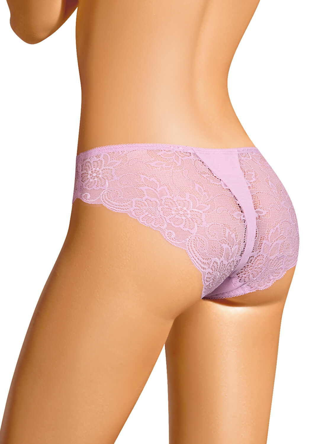 Трусы-бикини женские из эластичного хлопкового полотна. По бокам и спинке кружево. Обработка краев по талии - ажурная резинка с фестоном. Спереди бант.