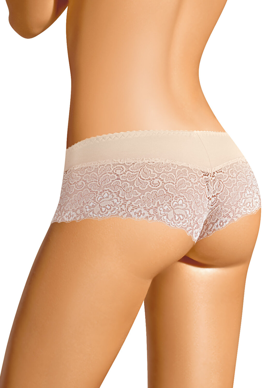 Трусы-шорты женские из эластичного хлопкового полотна. По переду и спинке кружево. Обработка краев по талии - резинка, по ноге - подгибка. Спереди бант.
