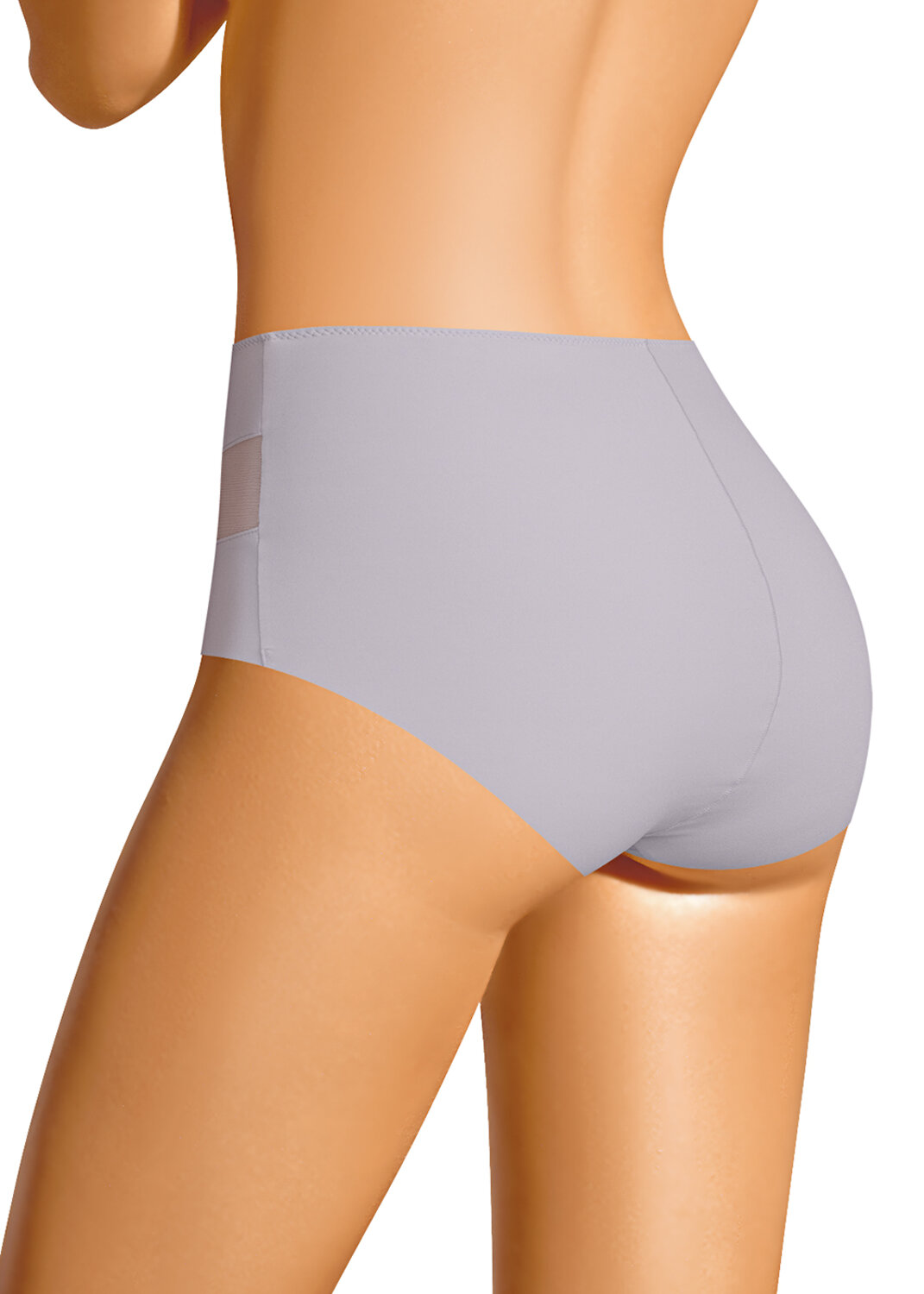 Трусы слипы с завышенной посадкой, сзади и по линии бикини бесшовная гладкая обработка, спереди декоративные диагональные вставки из плотной сетки, перед дублирован сеткой, по талии обработка с зигзагом и узкой резинкой