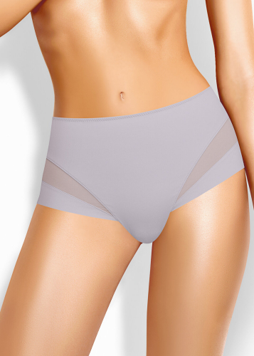 Трусы слипы с завышенной посадкой, сзади и сбоку бесшовная гладкая обработка, спереди декоративные горизонтальные вставки из плотной сетки, перед дублирован сеткой, по талии обработка с зигзагом и узкой резинкой.