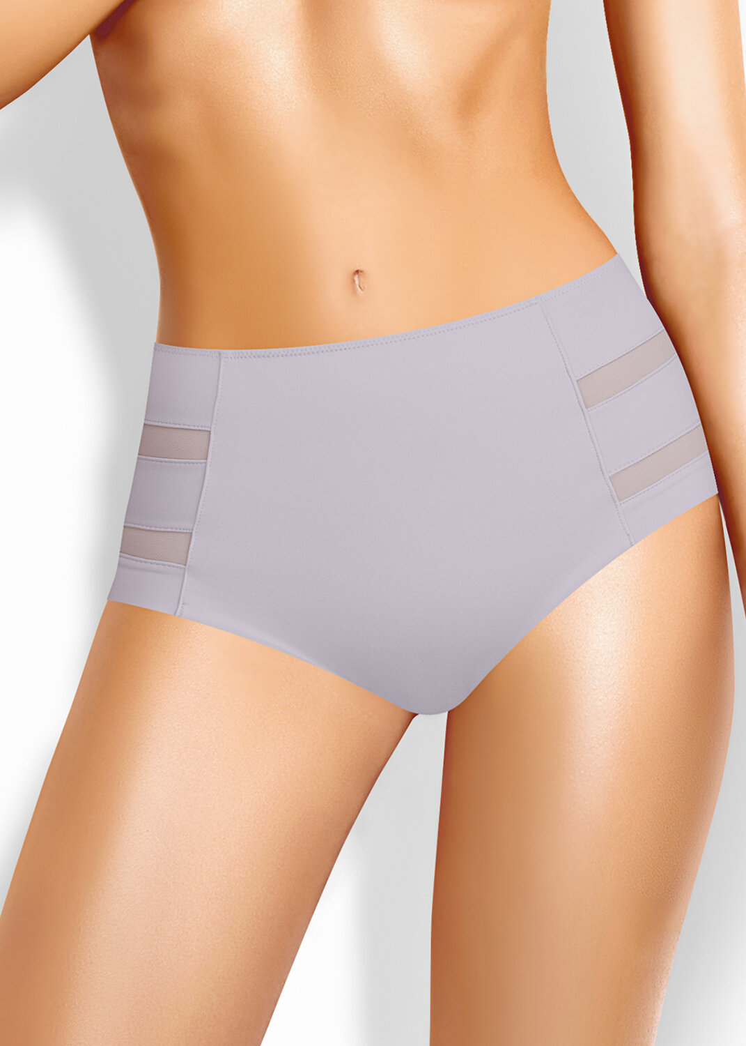 Трусы слипы с завышенной посадкой, сзади и сбоку бесшовная гладкая обработка, спереди декоративные горизонтальные вставки из плотной сетки, перед дублирован сеткой, по талии обработка с зигзагом и узкой резинкой.