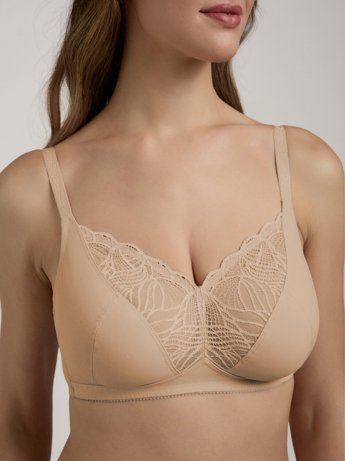 Классическая серия белья Aura создана из неэластичного функционального трикотажа и кружева с растительным рисунком. Белье эффектно подчеркивает женственные линии и гарантирует безупречную поддержку, необходимую для обладательниц пышных форм.