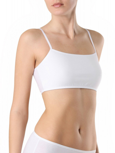 Топ женский из эластичного трикотажного полотна. Верх изделия обработан окантовкой переходящей в нерегулируемые бретели.