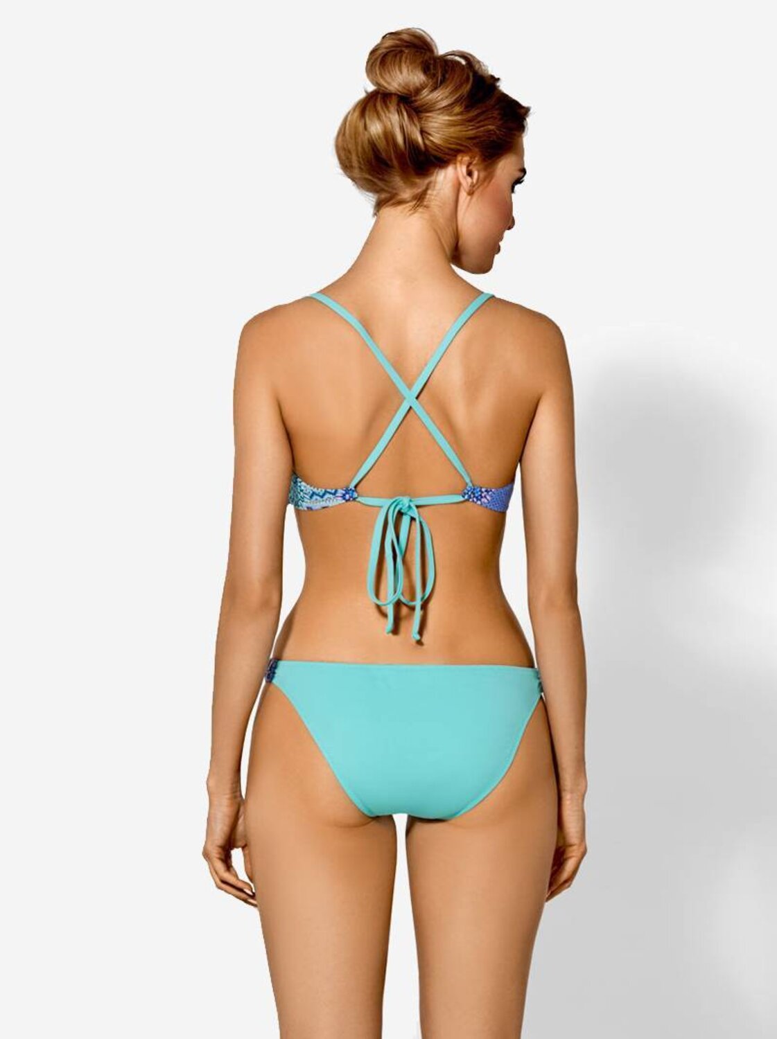 Лиф купального костюма из цветного эластичного полотна с жесткой формованной чашкой на каркасах и вкладышем «PUSH-UP». Фиксируется завязками — спагетти к лифу декоративными кольцами и крест на крест по спине. Трусы купальные «СЛИП» с низкой линией талии, декоративными элементами по бокам в цвет лифа.