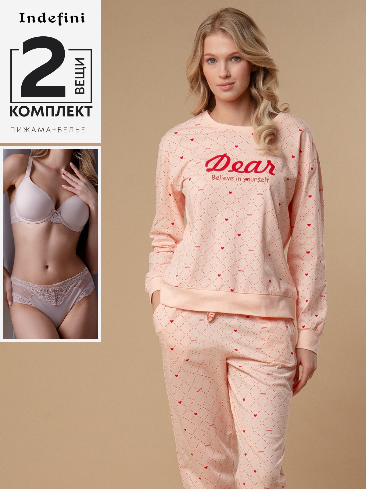 Женская пижама торговой марки Indefini, материнская серия. Женская пижама для девочек представляет собой комплект из кофты и брюк, созданные хлопка, обеспечивающем хорошую вентиляцию и воздухопроницаемость. Ткань мягкая и не растягивается после стирки.Кроме того, в костюме применен более популярный в этом году дизайн в форме ромба и принт в форме сердца, а комплект из серии "родитель-ребенок" создан для того, чтобы чувствовать себя полным любви. На пижаму нанесен яркий принт с мотивирующей надписью "Верь в себя" и рисунками сердечек. Эта женская пижама будет поддерживать уверенность и позитивное настроение у девушек и женщин, а также обеспечивать комфорт и уют во время сна. Верхний дизайн выполнен в более популярном в настоящее время дизайне с курсивными буквами.