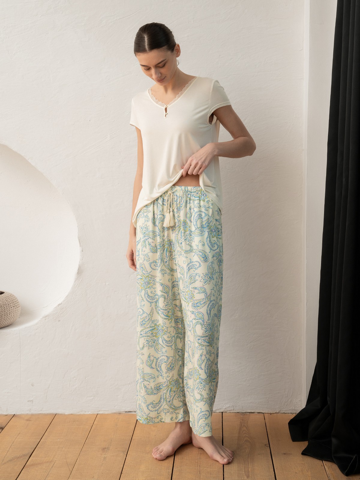 Пижама женская состоит из футболки и брюк. Футболка прямого свободного кроя изготовлена из бамбукового трикотажа и выполнена в классическом белом цвете. Имеет короткие рукава и V-образный вырез в зоне декольте, обрамленный кружевом, застёгивающийся на две пуговицы. Брюки прямого свободного кроя изготовлены из вискозной ткани, имеют мягкую тянущуюся резинку на талии с регулирующим шнурком. Брюки дополнены боковыми карманами и украшены цветочным принтом.
