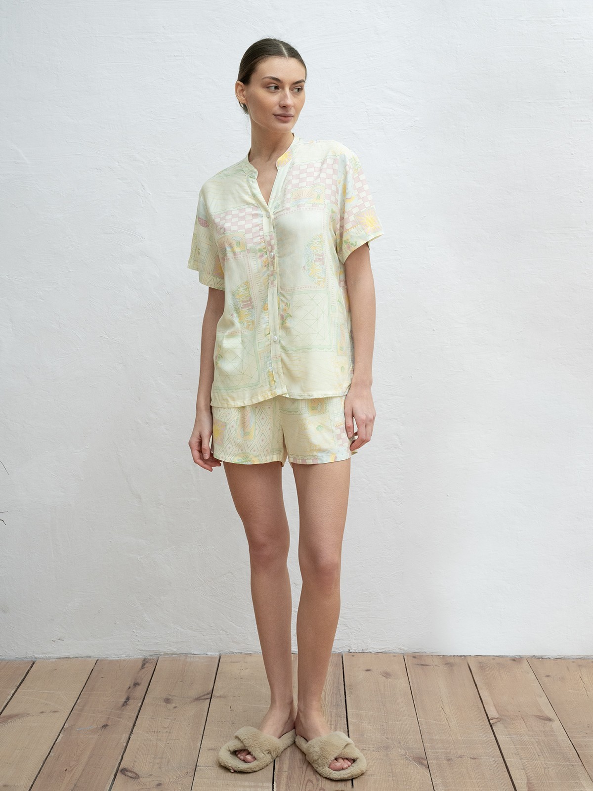 Пижама выполнена в цвете мультиколор с абстрактным принтом.