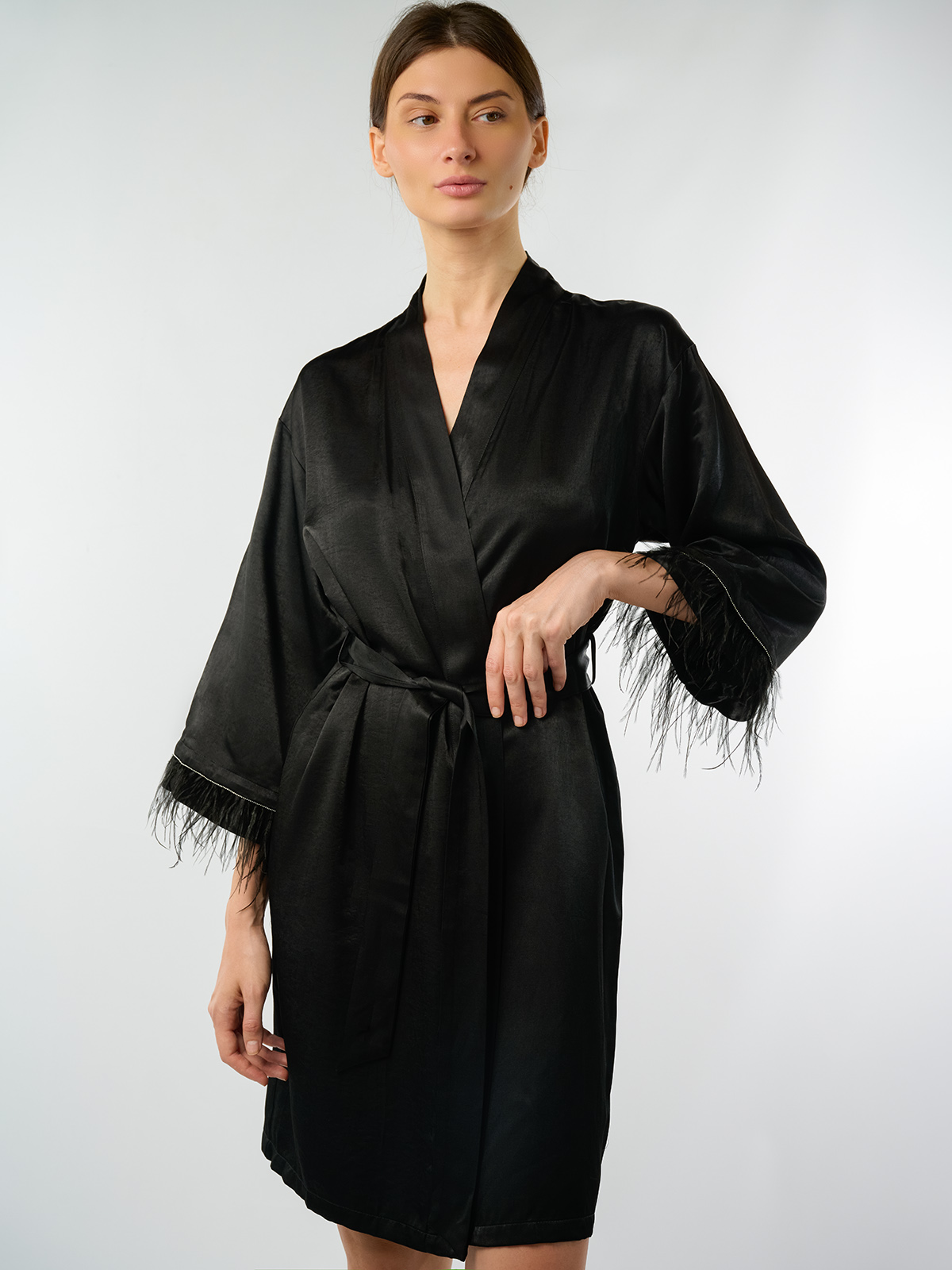 Модель выполнена в черном цвете с изысканными перьями на рукавах. Декоративные элементы с креплением на кнопках — их можно быстро отстегнуть.