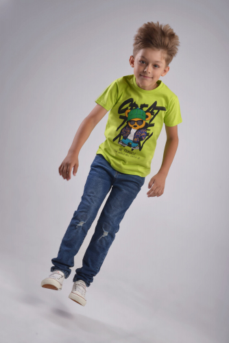 Футболка для мальчика свободного кроя и классической длины из качественного мягкого хлопкового полотна 170 г/м2 с transfer print (трансфер принт) - технологией нанесения картинки на изделие с использованием высоких температур. Хулиганский принт с танцующими скелетами и динамичный слоган - привлекательный элемент и яркий нестандартный ход в детской одежде.