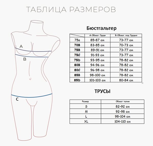 К бюстгальтеру идут трусики, размерами: 75B-S, 75C-M, 75D-L, 80B-M, 80C-L, 80D-XL, 85B-XL, 85C-XL.