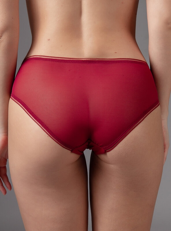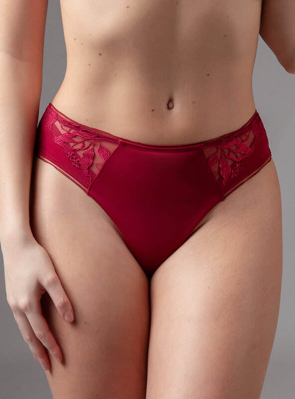 Комплект нижнего белья от торговой марки Индефини. В комплекте бюстгальтер и трусики. Бюстгальтер из полиамида, глубокого красного цвета, на косточках, с формованной чашкой, с поролоновой подкладкой, на кружевном поясе, с обрамлением, на тонких регулируемых лямках. Трусы-слипы из полиамида, глубокого красного цвета, с кружевными вставками и обрамлением, средней посадки, на мягкой резинке.