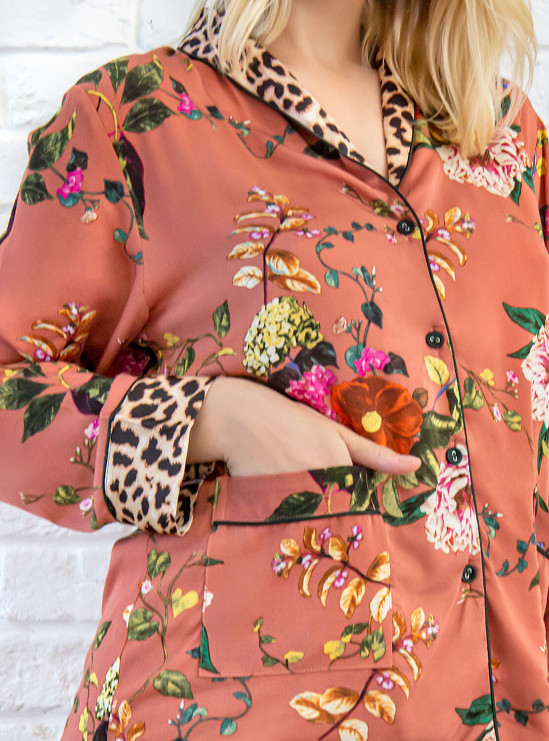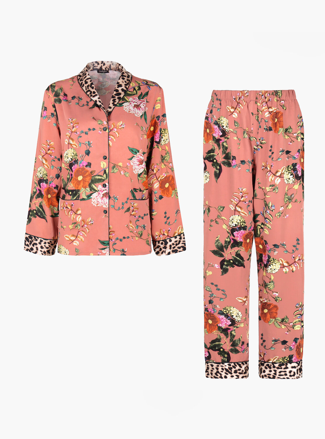 Домашняя пижама от торговой марки Индефини. В комплекте рубашка с брюками. Рубашка из вискозы, красно-коричневого цвета, с цветочным принтом, со вставками леопардового принта, с длинными рукавами, с воротником-отворотом, с кармашками по бокам, на пуговичках, прямая, свободного кроя. Брюки из вискозы, красно-коричневого цвета, с цветочным принтом, со вставками леопардового принта, на мягкой резинке, прямые, свободного кроя.