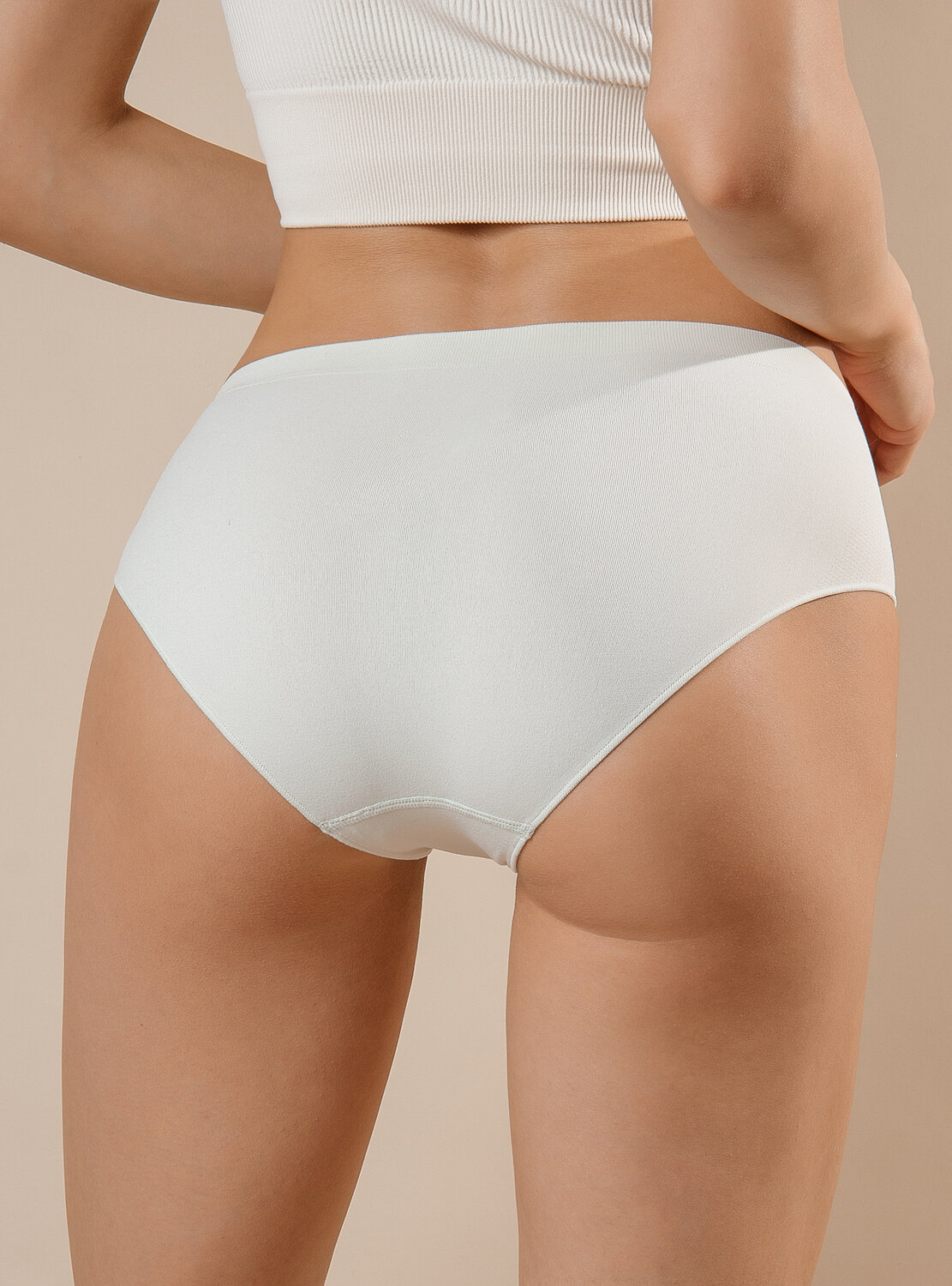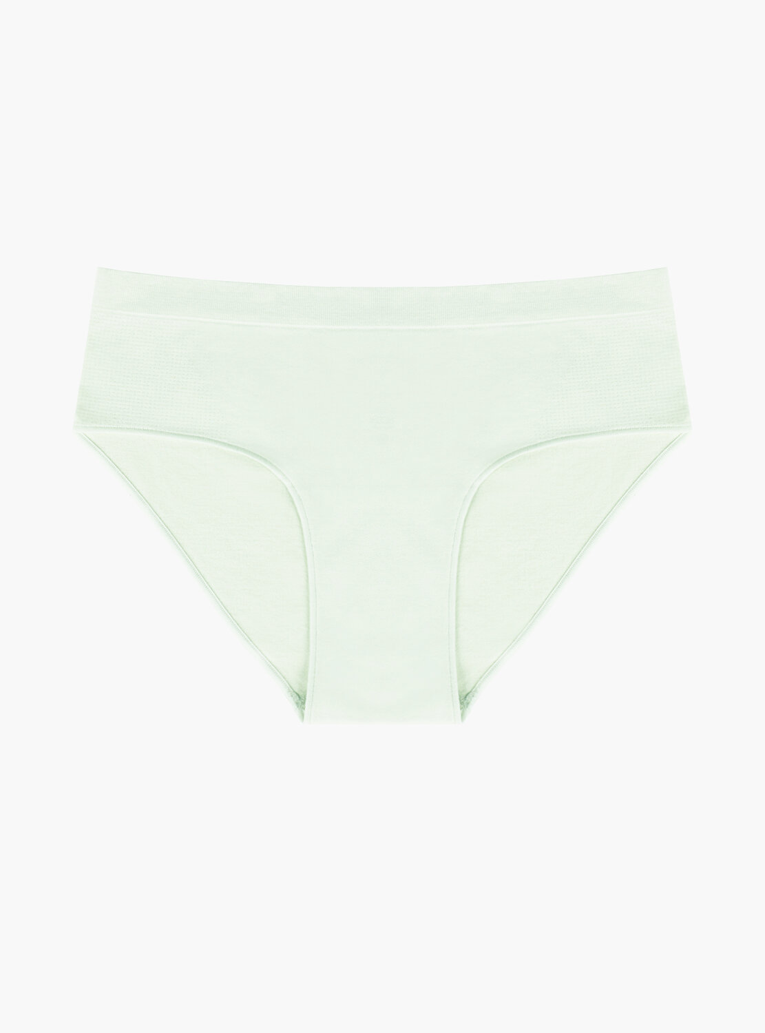 Женские трусы от торговой марки Индефини. Трусы-слипы светлого цвета с высокой посадкой, изготовлены из мягкой микрофибры в тонкий рубчик без боковых швов, дополнены гигиенической хлопковой ластовицей, вырезы для ног обработаны плоским швом вподгибку с резинкой, широкий пояс на резинке плотно фиксирует на теле. Зеленый