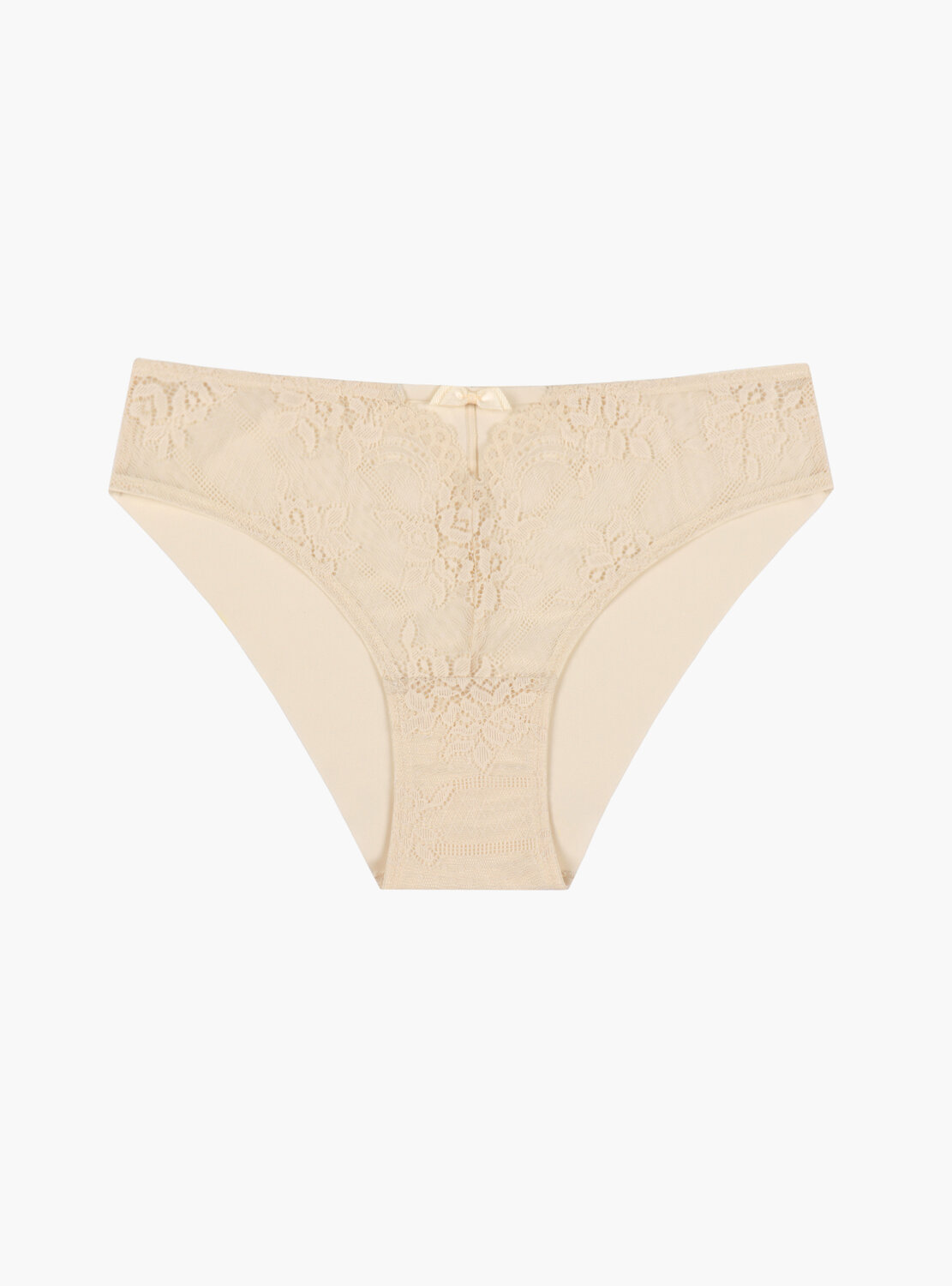 Трусы-слипы нежного бежевого оттенка, выполненные из мягкой эластичной ткани. Модель украшена изящной кружевной вставкой с миниатюрным бантиком в передней части.