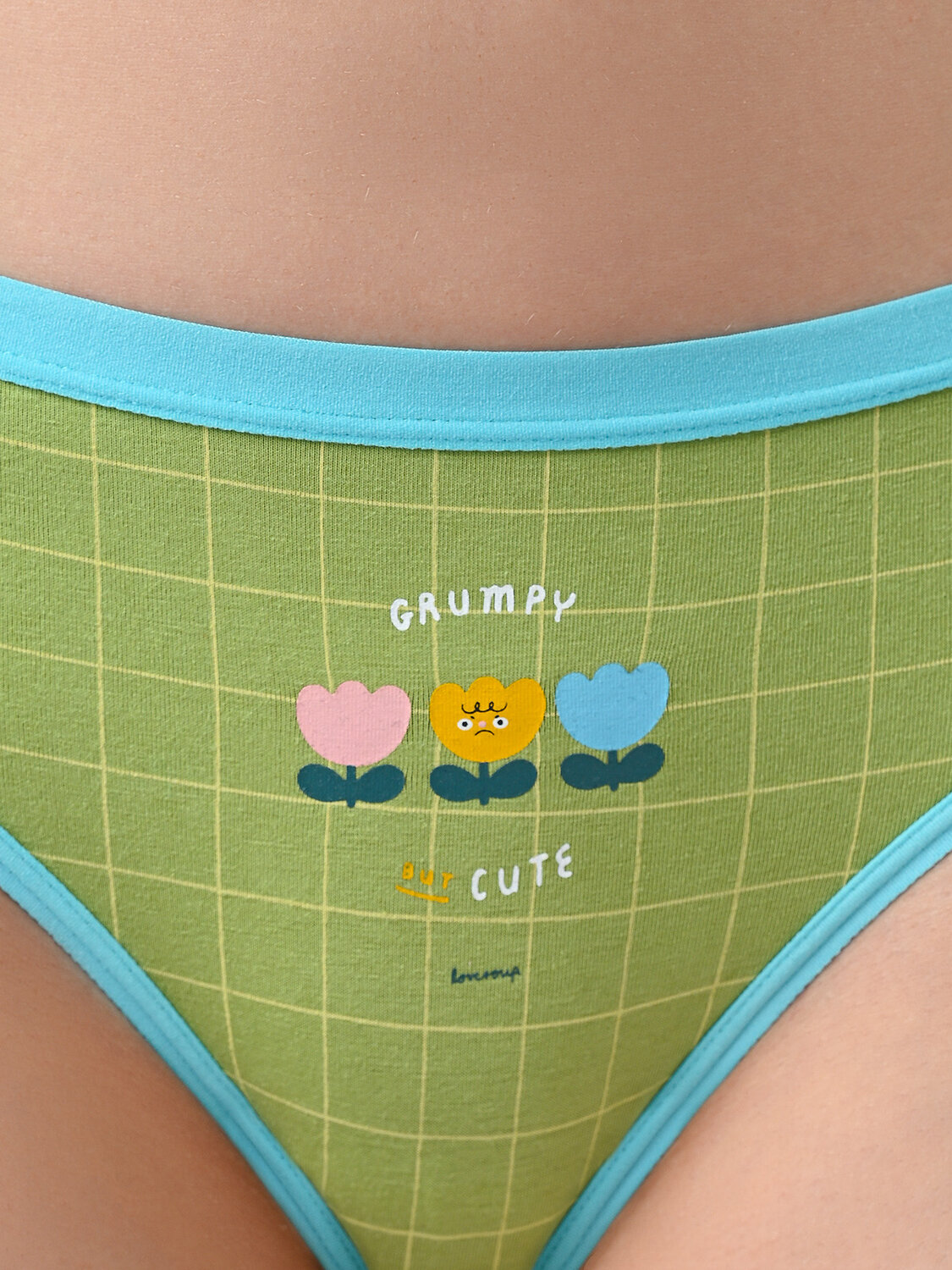 Трусы слипы женские изготовлены из хлопка, выполнены в зеленом цвете. Трусы средней посадки держатся на талии мягкой резинкой. На внутренней стороне трусов имеется хлопковая ластовица. На трусы нанесён принт в клетку с изображением цветочков и надписи.