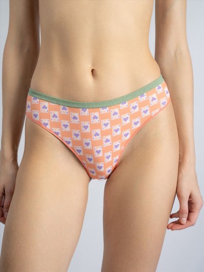 Оптовая продажа. Трусики слипы женские оранжевого цвета с изображением червовых карт, из высококачественного мягкого хлопка с добавлением эластана, повышающий прочность и качество одежды, создавая идеальное облегание фигуры (хлопок 95%, эластан 5%). Имеют среднюю посадку, мягкую и эластичную резинку по талии зеленого цвета. Гигиеничная хлопковая ластовица позволяет избежать трения и раздражения кожи. Удобная и комфортная модель для повседневного белья. принт (принт)