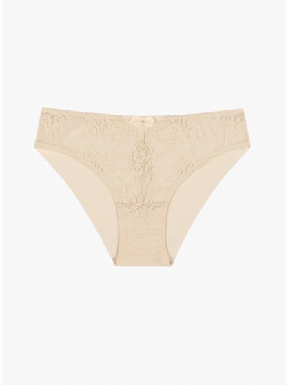Оптовая продажа. Трусики слипы женские нежно-бежевого оттенка из мягкой и эластичной ткани (полиамид 71%, эластан 29%), со средней линией талии, гигиеничной хлопковой ластовицей. Модель украшена изящной кружевной вставкой с миниатюрным бантиком в передней части.