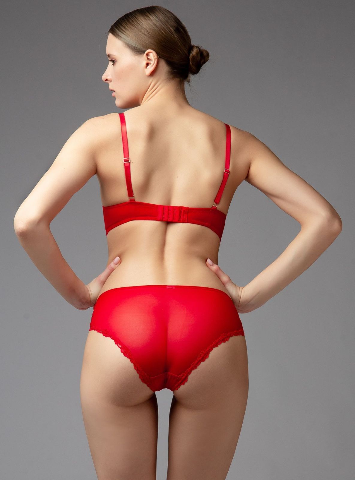 Комплект нижнего белья от торговой марки Индефини. В комплекте бюстгальтер и трусики. Бюстгальтер из полиамида, красного цвета, из кружевной ткани, с цветочным принтом, с кружевным обрамлением, на косточках, с боковыми косточками, с небольшим Push-up, на тонких бретелях, на широком атласном поясе, с застежками-крючками, бретели регулируются. Трусы-слипы из полиамида, красного цвета, из кружевной ткани, с цветочным принтом, с кружевным обрамлением, на мягкой резинке, средней посадки.