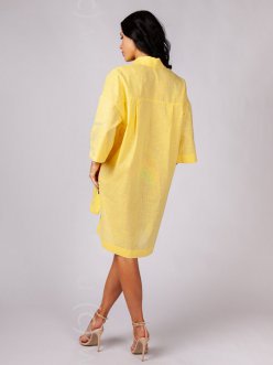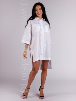 Рукава туники широкие, спущенные. Особенностью дизайна модели является ассиметричный подол и боковые разрезы до уровня бедер. У туники застежка на пуговицах на всю длину изделия, для удобства есть внутренние карманы. Воротник отложной. Два нагрудных кармана. 100% хлопок